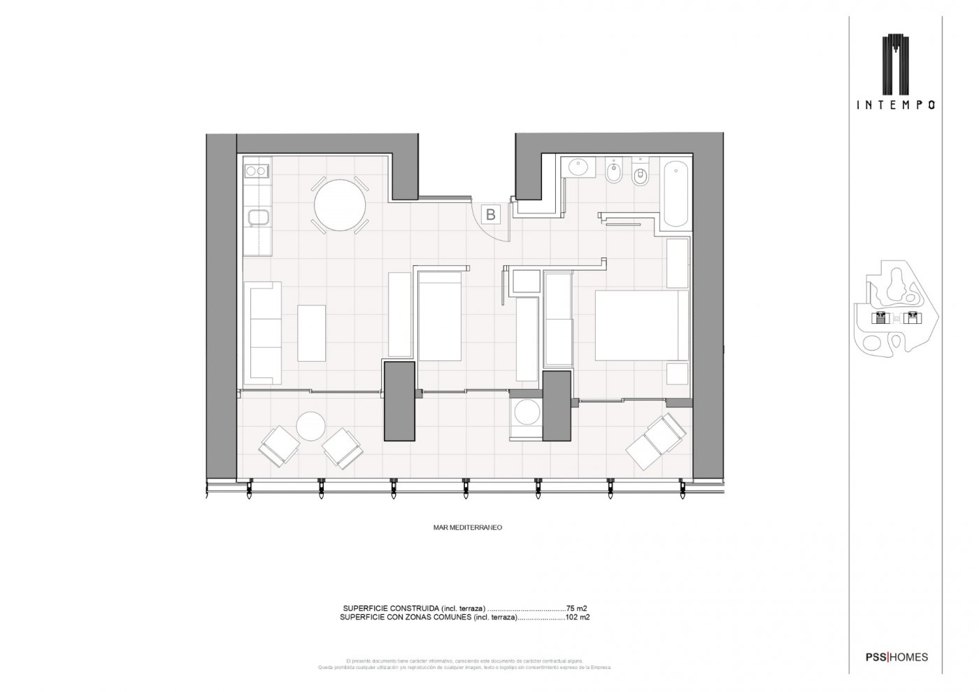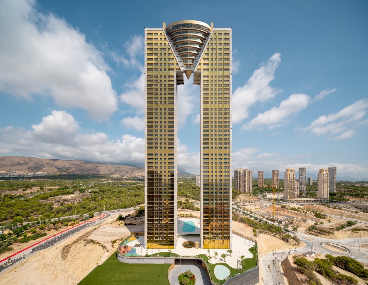 Intempo Sky Resort, located just 200m from Poniente beach in Benidorm, is the tallest residential building in the EU that stands out for its privileged location and exceptional views of the Mediterranean Sea.~~Apartment with a constructed area of 75 m2, is distributed in 2 bedrooms with large built-in wardrobes, 1 bathroom with a hydromassage bathtub, and an open-plan kitchen joined with the living room and access to a terrace with panoramic views. The kitchen is equipped with furniture, a countertop and electrical appliances. Aluminium windows with double glazing, thermal break, and low solar factor. All apartments come with underground parking space and a storage room.~~Residential complex with 6,500 m2 of communal areas. On the ground floor there is access to a large area with sunbeds, a beach-style pool and a kid's pool. On the 46th floor you can enjoy a spa with heated Infinity pool, a gym, massage cabins and a sauna, on the 47th floor there is a chill-out terrace with Jacuzzis and Balinese beds.~~Also available apartments with 2 bedrooms and 2 bathrooms, and 3 and 4 bedrooms.~Characteristics