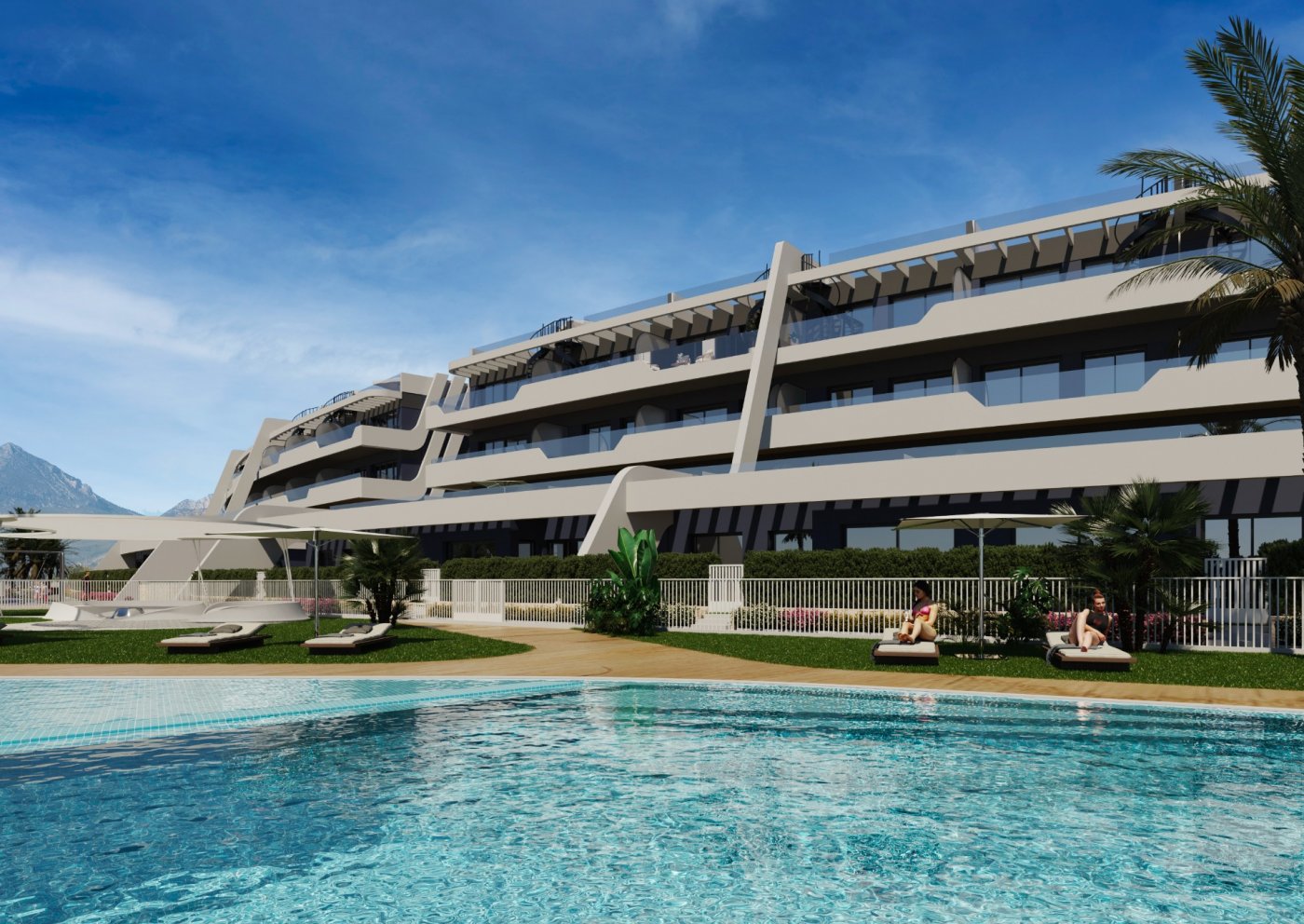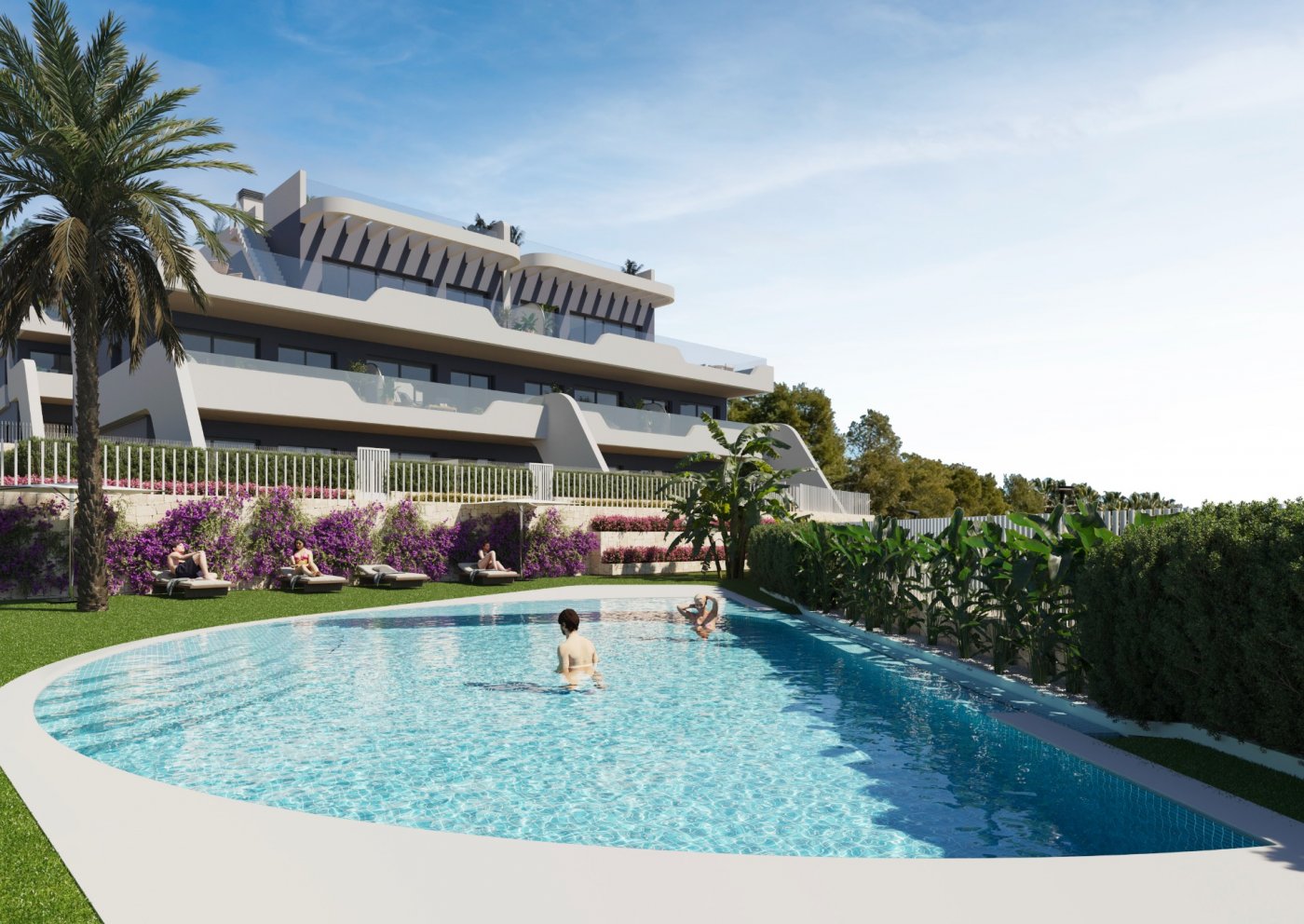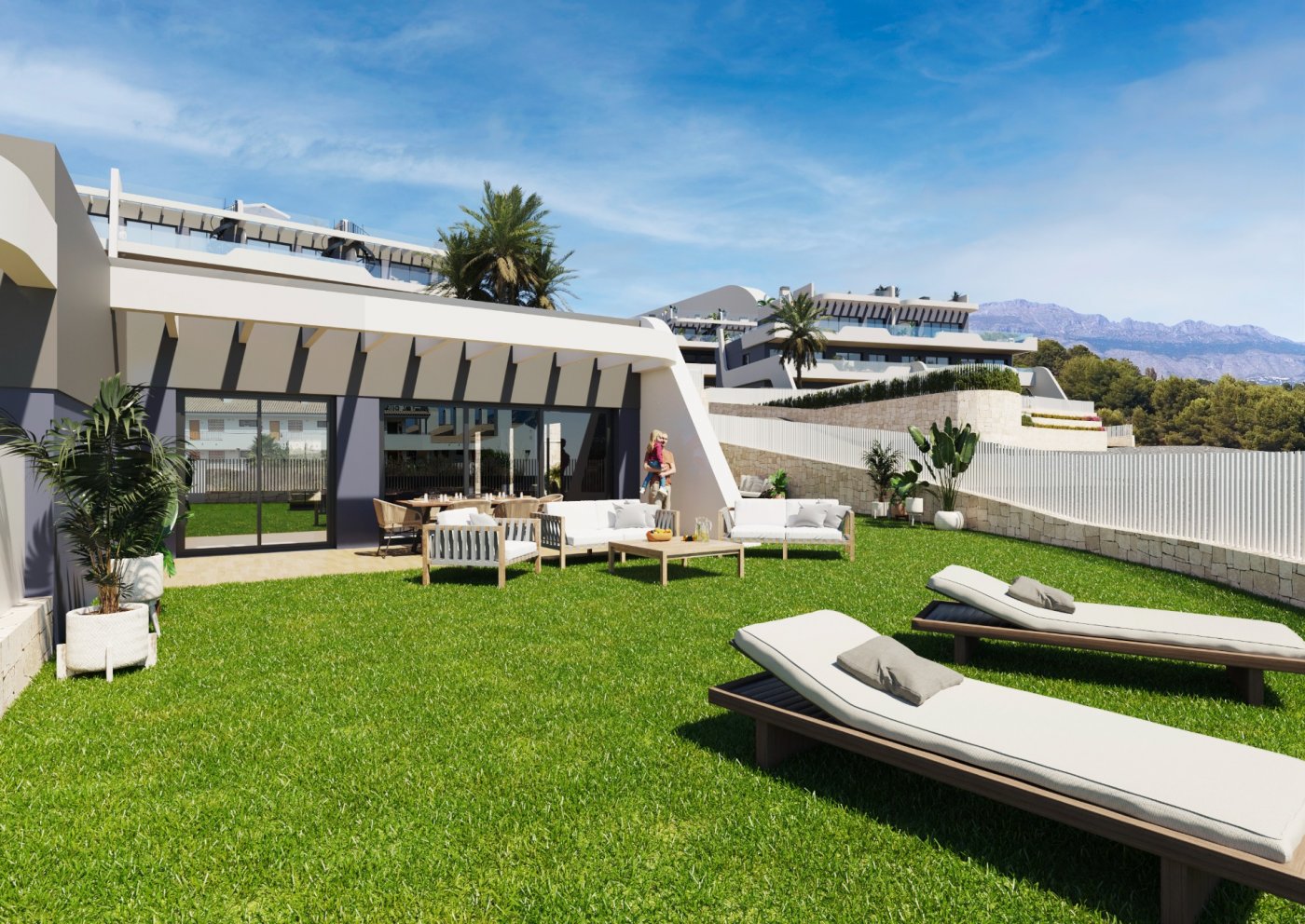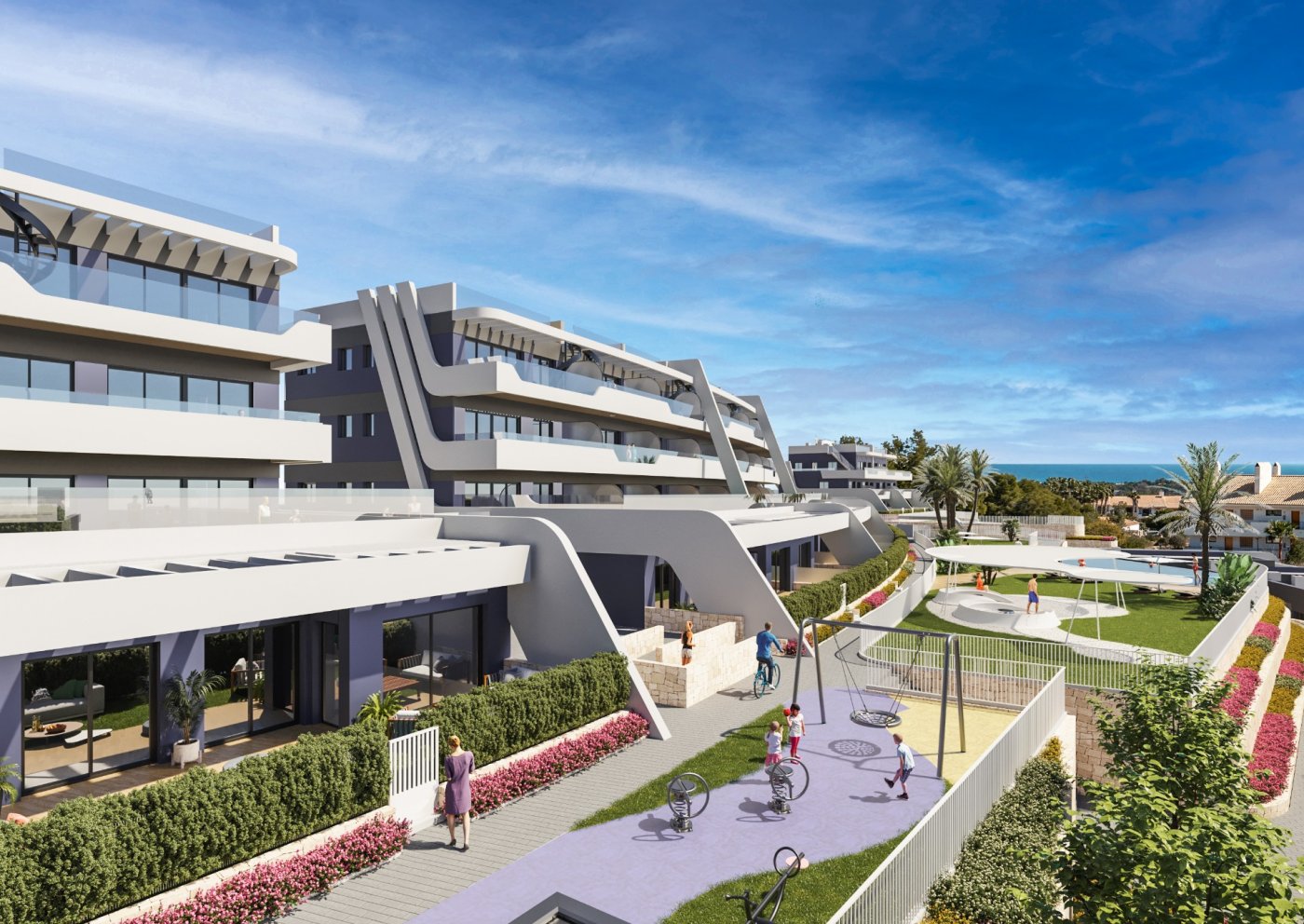 Brand-new apartments for sale in Alfaz del Pi, new residential complex of 117 apartments of 4 different types.~~This apartment has 74 sq m of built surface area and is based on the ground floor of the 3-storey building. It has 2 bedrooms, 2 bathrooms, an open-plan kitchen, and a bright living-dining room with access to the covered terrace from where you can go out to your small private garden area, with unobstructed views of the sea. Also available 3-bedroom apartments, apartments without garden, and rooftop penthouses.~~Fantastic community areas where to disconnect, with garden spaces, childrenās playground, and two infinity pools with views of the bay.~~Excellent location only 1 km to the town centre where you will find all local amenities, such as supermarkets, pharmacies, health centre, etc... 2 minutes away to the Alfaz del Sol sports club, and only a 5-min drive to the beach.~~Characteristics