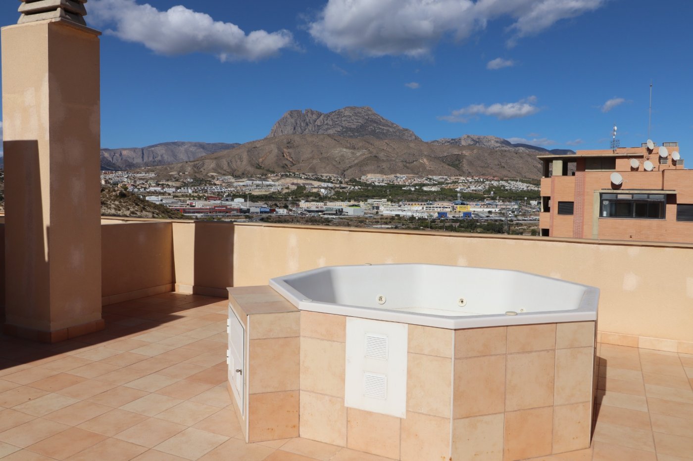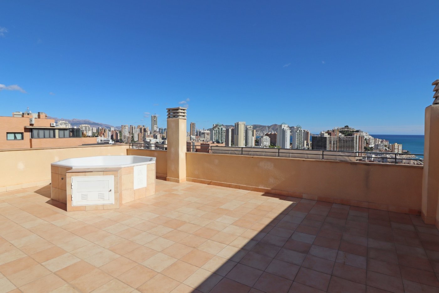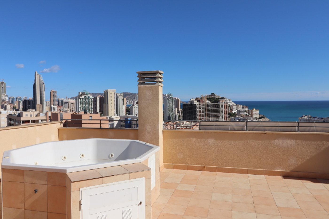 Exclusivo Ático en venta con dos terrazas descubiertas y espectaculares vistas panorámicas al mar y montaña, situado a tan sólo 7 min a pie de la playa de La Cala de Villajoyosa y cerca de todos los servicios.~ ~ El ático está a estrenar, tiene acabados de alta calidad, armarios empotrados en cada dormitorio, preinstalación de aire acondicionado y cocina equipada con muebles altos y bajos, horno, vitrocerámica y campana extractora.~ ~ Se distribuye en dos niveles más la espaciosa terraza-solárium de 90 m2 con bañera de hidromasaje de obra y fantásticas vistas al mar y a la montaña Puig Campana. Cuenta con 3 dormitorios dobles, 2 cuartos de baño, 1 aseo, salón-comedor, cocina independiente y amplia galería. Tanto del salón-comedor como del dormitorio principal hay acceso a la terraza descubierta con vigas y vistas al mar. Gracias a su orientación este, la vivienda es muy soleada y luminosa. Viene con plaza de aparcamiento subterránea, apta para un coche grande, y trastero.~ ~ Urbanización cerrada con conserje, piscina comunitaria, piscina de baja profundidad para niños, 3 ascensores, zonas ajardinadas y área de juego infantil, situada a 600 m (7 min a pie) de la playa de La Cala de Villajoyosa. En la zona dispone de varios supermercados, farmacias, paradas de bus y de taxi, bancos, centro de salud, así como varios bares y cafeterías. Cada martes y sábado en La Cala hay mercadillo donde se puede comprar frutas, verduras u otros productos; el centro comercial la Marina y el hipermercado Carrefour están a 3 min en coche o 15 min a pie.~Características