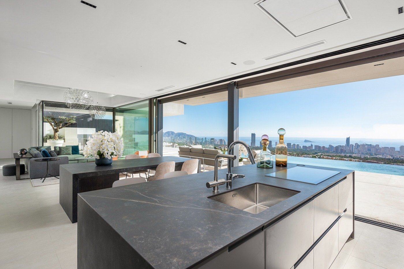 Viviendas de obra nueva más exclusivas de la urbanización residencial Sierra Cortina Resort en el término municipal de Finestrat.~ ~ Se trata de un complejo residencial lujoso y privado que consta de tan sólo 5 villas, todas con vistas despejadas al mar y a la zona. Cada villa tiene una superficie de más de 500 m2 distribuidos entre el sótano, dos plantas residenciales y la terraza-solárium.~ ~ El sótano es un amplio garaje para dos vehículos, con ascensor con capacidad para 6 personas que sube a todas las plantas de la villa. Las viviendas destacan por su calidad premium e interiores cuidadosamente diseñados. La magnífica zona lounge de primera planta se compone por el salón-comedor unido con la cocina americana totalmente equipada y con acceso a la terraza cubierta con barbacoa y piscina infinity de 60 m2 de lámina de agua.~ ~ En la segunda planta se hallan 4 dormitorios dobles, cada uno con su propio cuarto de baño en-suite, su propia terraza y armario empotrado. El dormitorio principal tiene además un lujoso vestidor a medida con frentes de cristal fumé, cajoneras, estantes con luz y barras de colgar. La tercera planta es la magnífica terraza solárium con preinstalación para un jacuzzi.~ ~ Pavimento de gres porcelánico antideslizante en los exteriores, aislamiento térmico-acústico e impermeabilizaciones, acabado de gres porcelánico en el interior, escalera de madera, carpintería de aluminio y doble acristalamiento de vidrio laminado y templado con sistema de control solar y bajo emisivo, aire acondicionado por conductos, agua caliente sanitaria por placas solares, calefacción por suelo radiante, domótica, diseño de paisajismo y ajardinamiento con riego automático y programador.~ ~ Sierra Cortina Resort es una urbanización cerrada con control de accesos, 15 cámaras de videovigilancia conectadas a policía local, patrullas de seguridad 24 horas, restaurante, un club social, gimnasio, spa y Golf Pitch and Putt de 18 hoyos.~Características
