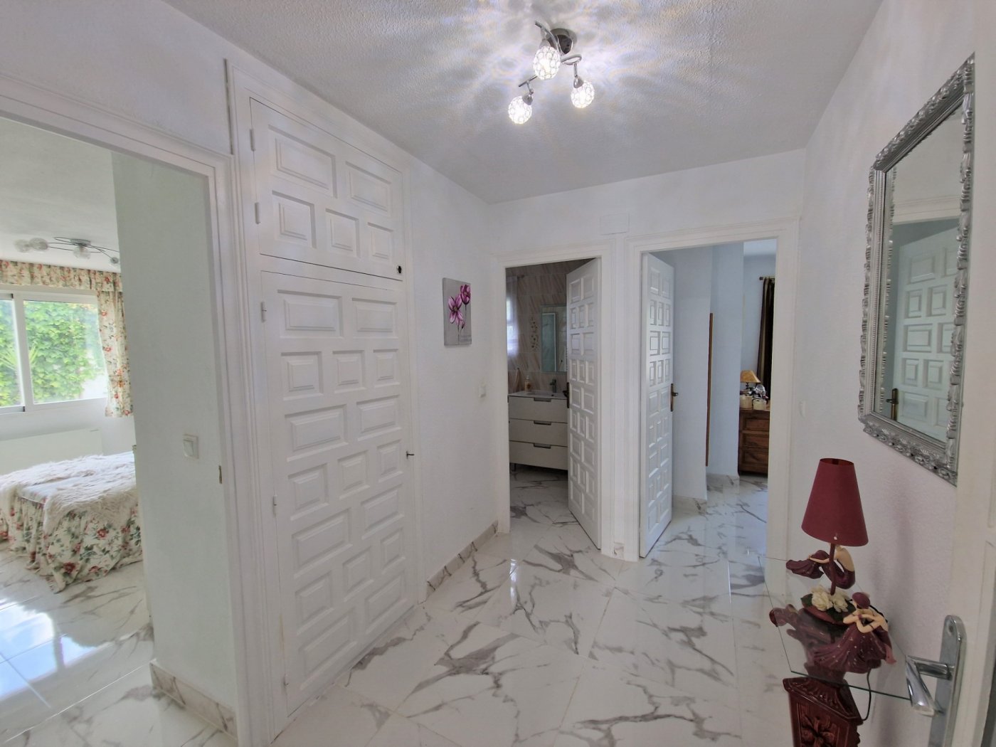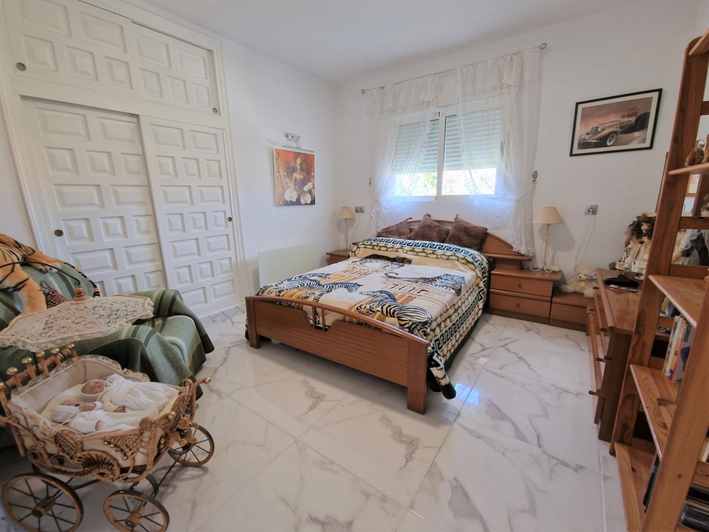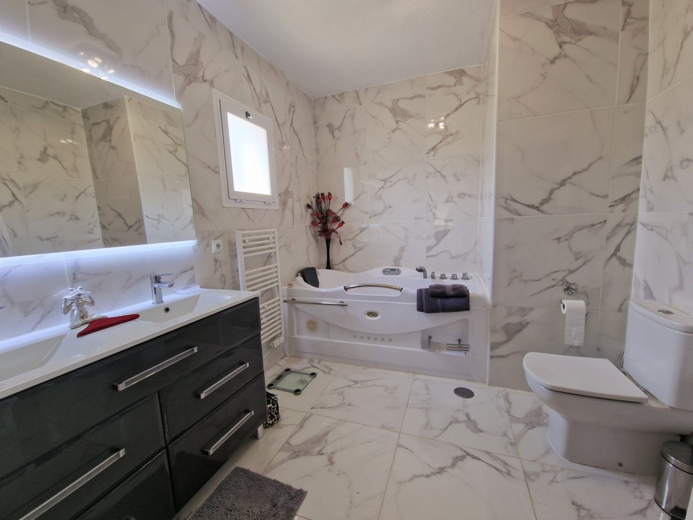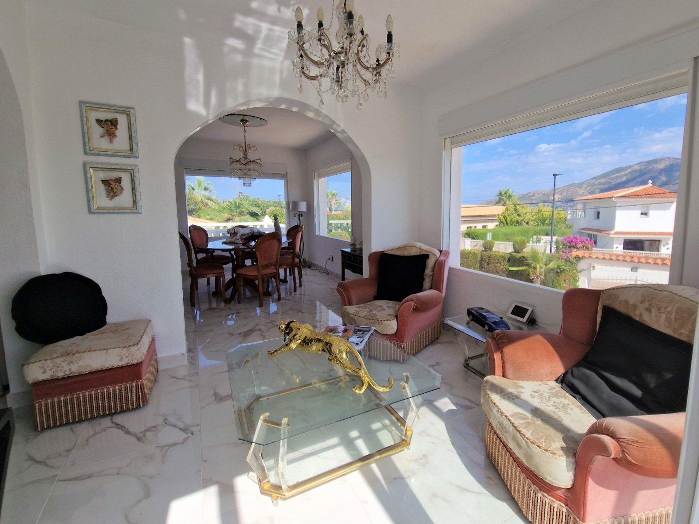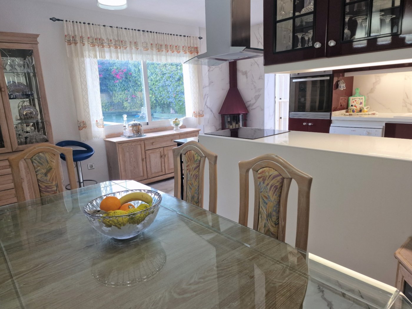 Spacious villa in excellent condition, completely renovated in 2020, located in a very quiet area near the town of Alfaz. It is distributed over two floors that could be two independent houses, if the kitchen were put back on the ground floor, a space that is currently a bedroom.~~The house has 5 bedrooms, 4 bathrooms, 2 living rooms, a large garage for 2 cars, a swimming pool, a built-in barbecue. The outdoor space is big enough to park 4 more cars.~~On the main floor there is a living room, an independent kitchen with access to the outside, 3 bedrooms, 2 bathrooms and a large laundry room. On the first floor there is a large living-dining room with a fireplace and access to two open terraces, 2 bedrooms and 2 bathrooms, one of them en suite. From the terrace-solarium there are fantastic views of the bay and the mountains.~~The house has a hot-cold air conditioning installation, is in perfect condition and ready to move into. Garden with a lot of privacy. Private pool 8×4.~Characteristics