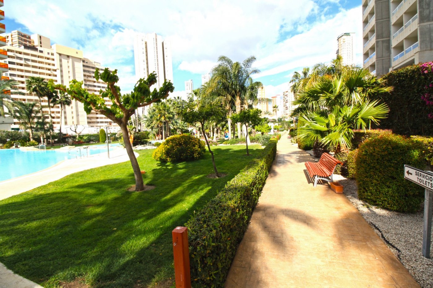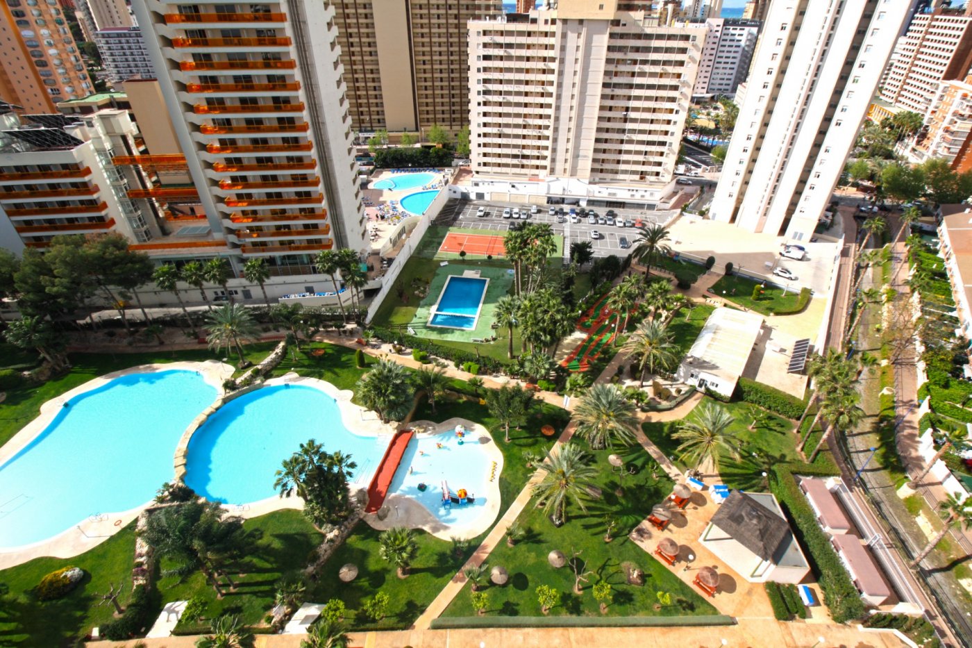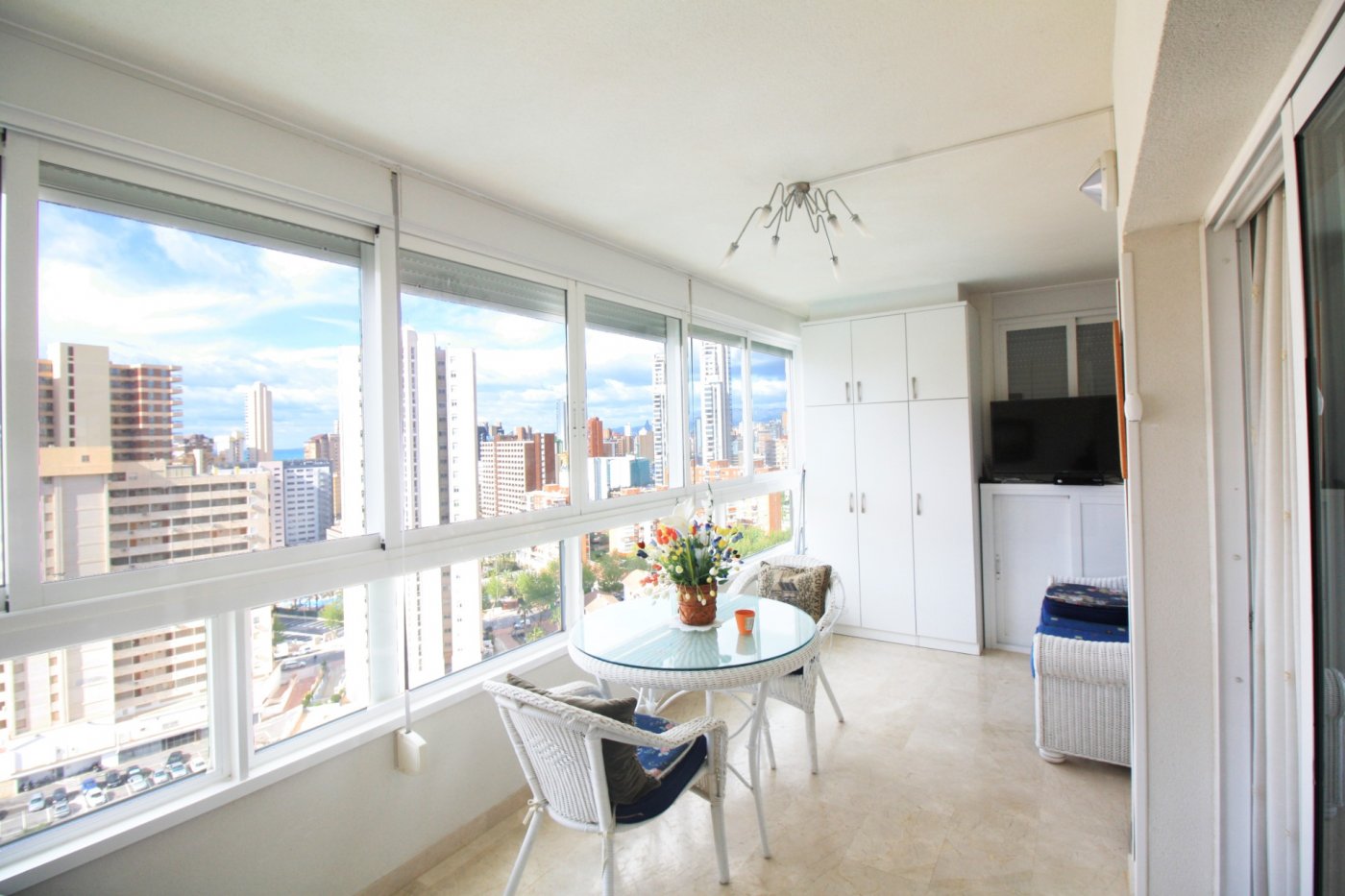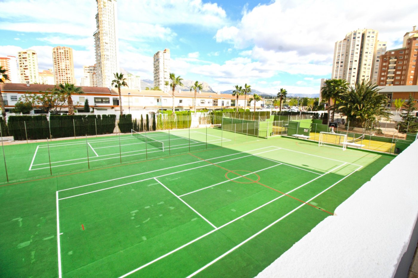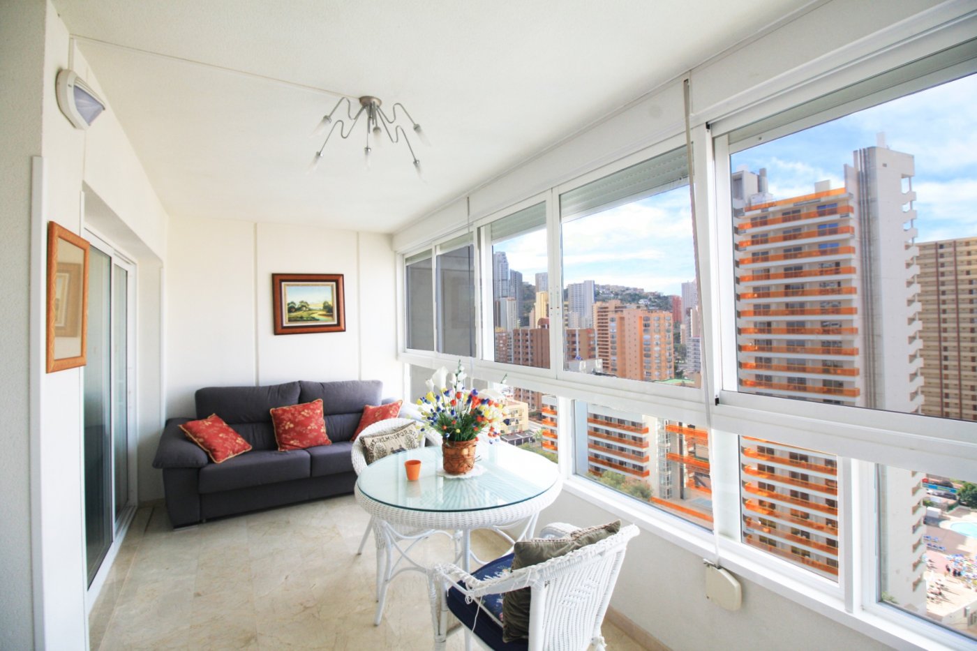 Beautiful 2-bedroom apartment for sale in a magnificent gated complex in lower Rincon de Loix, Benidorm. ~ ~ Completely flat area with everything you need right on your doorstep and very close to the Levante beach! The apartment 2 double bedrooms, 1 bathroom en suite to the master bedroom, 1 shower room, a separate fitted & equipped kitchen with a utility room, and a good-size living area which goes out to a nice glazed balcony with lovely views of Benidorm. ~ ~ The apartment has integrated air conditioning and comes with allocated parking space. The complex is one of the best in the area and benefits from a large open-air swimming pool, kids’ pool, green areas with a bar, a heated swimming pool, gym, several tennis courts and mini golf. You are just a 7-min walk to the Levante beach and have all bars restaurants, shops, and public transport on your doorstep.~Characteristics