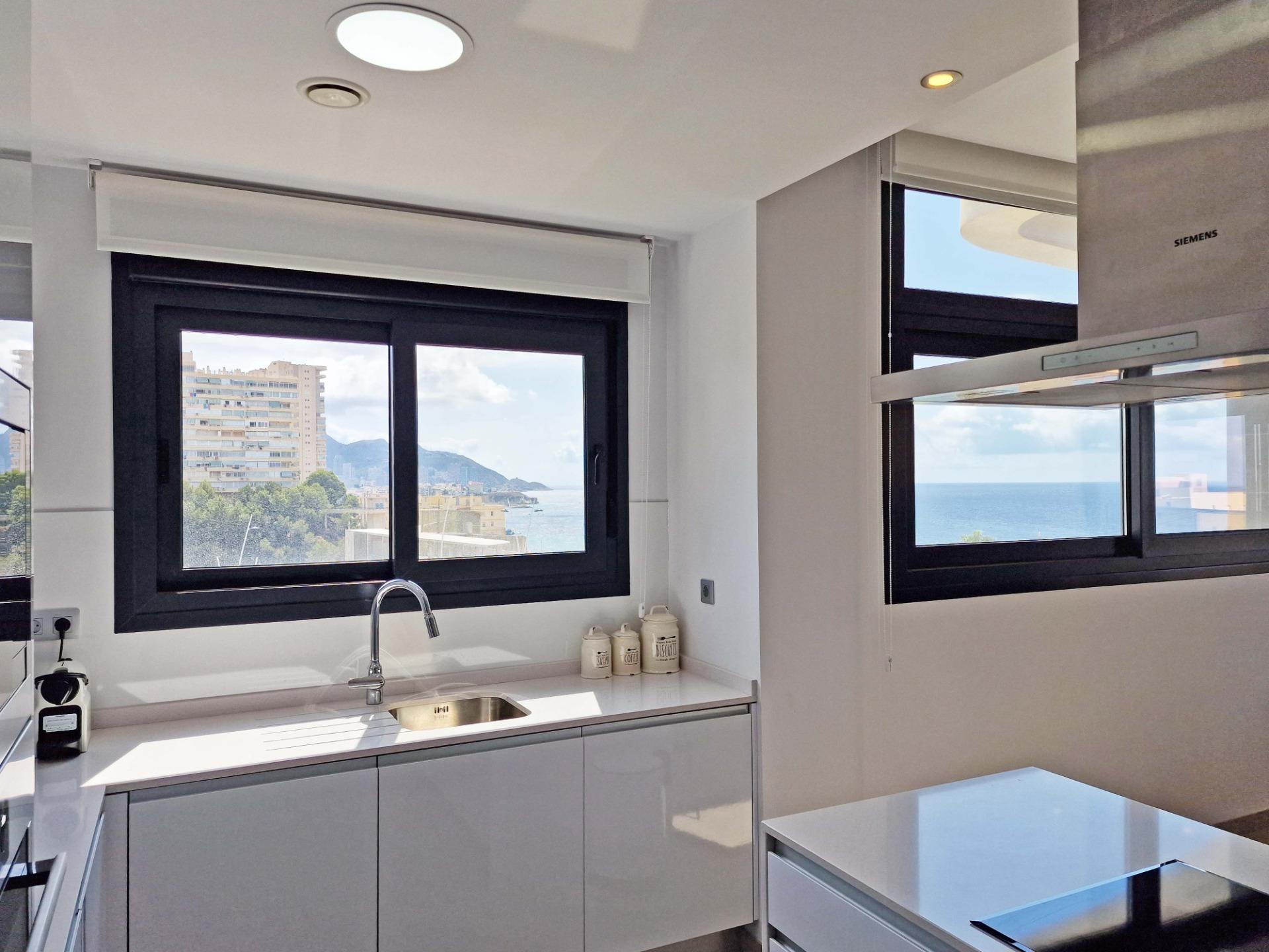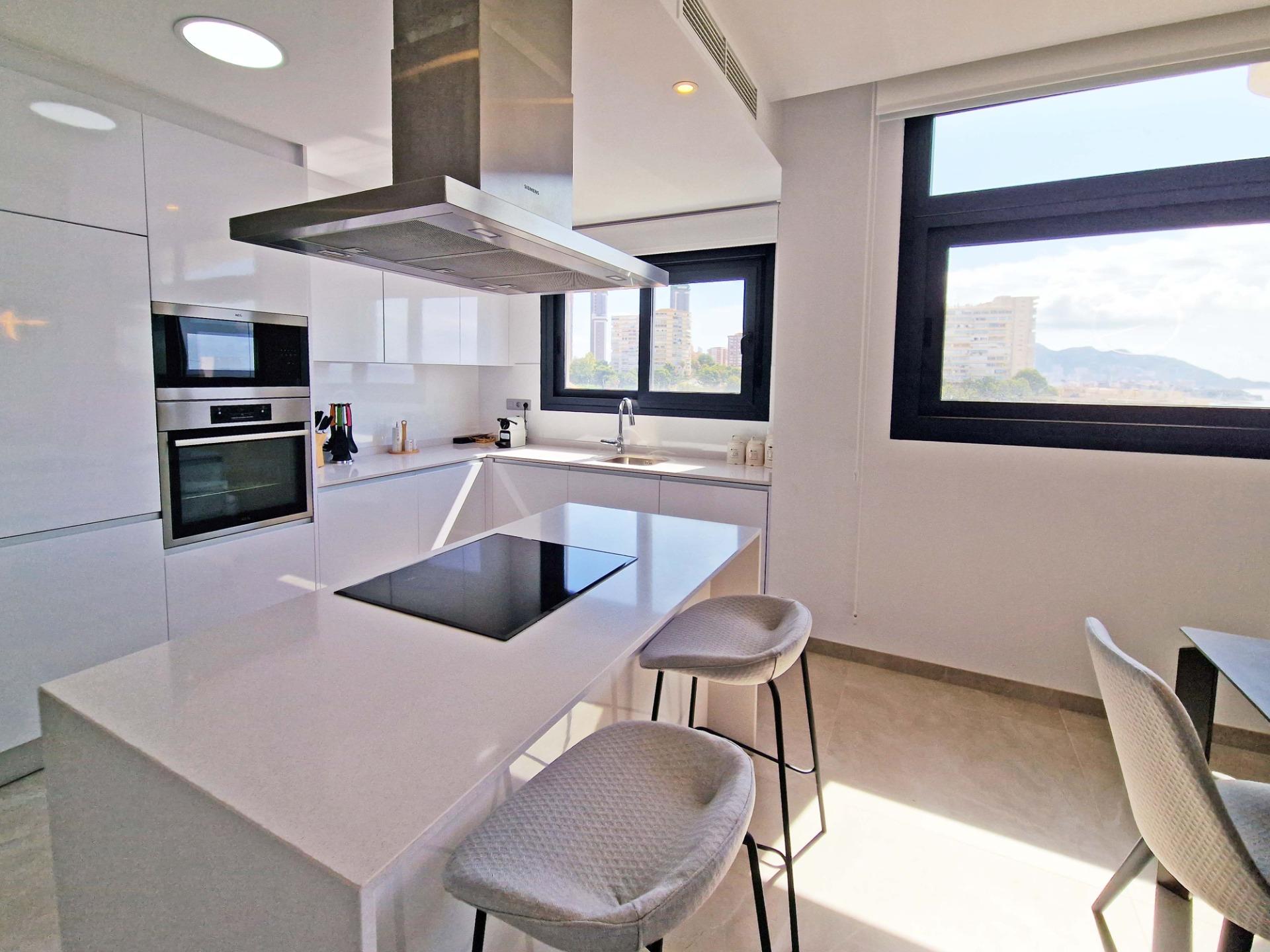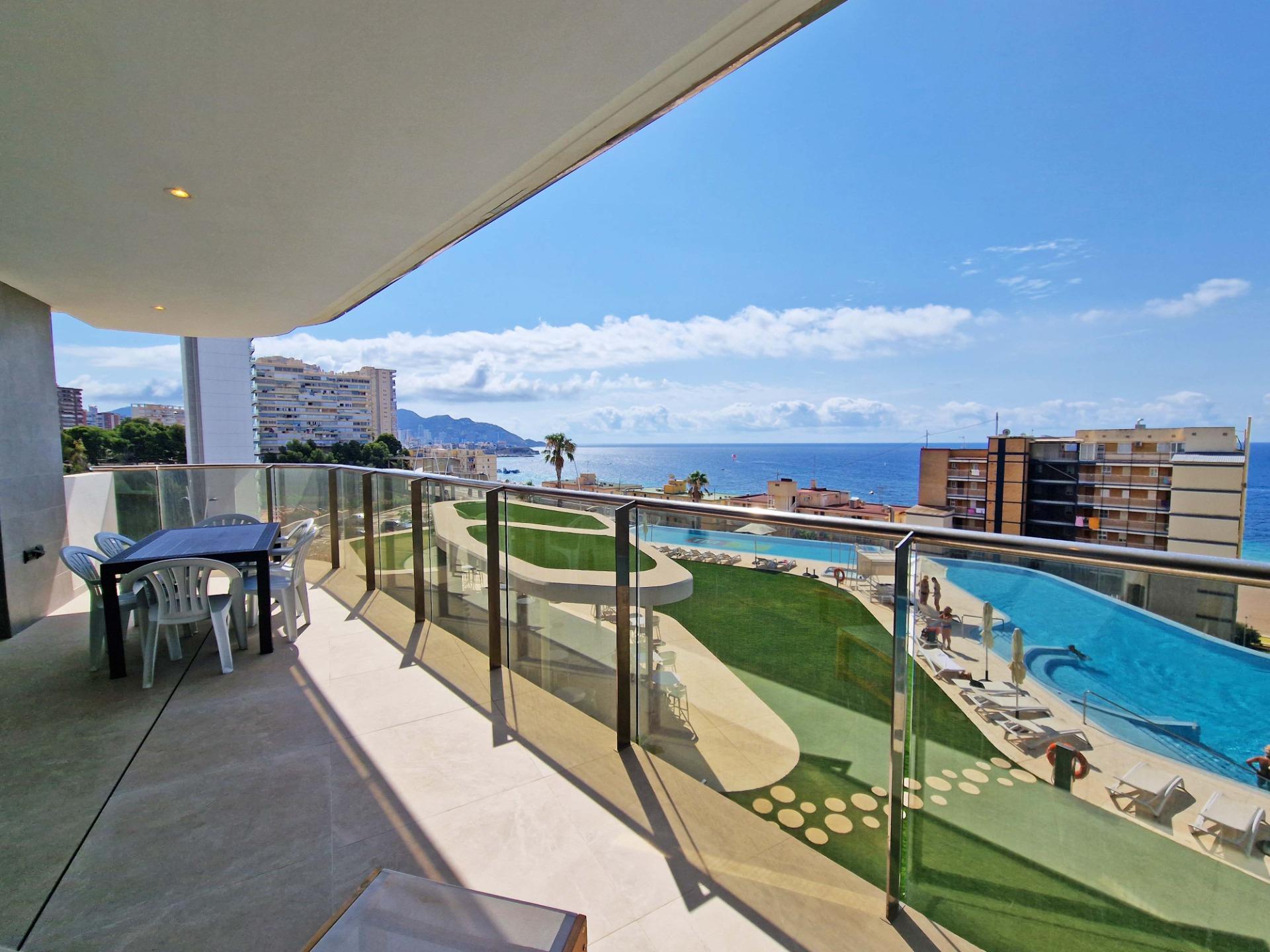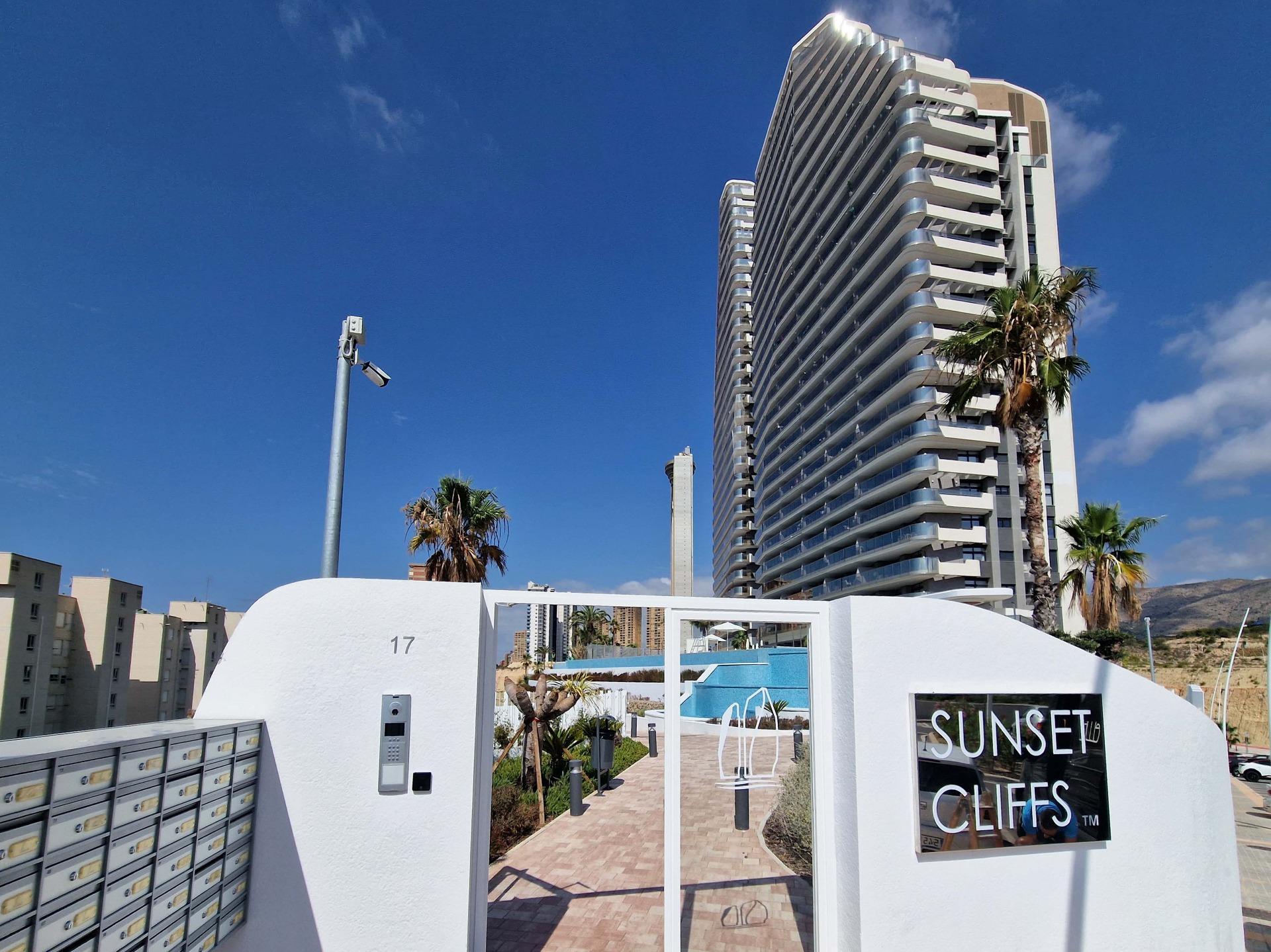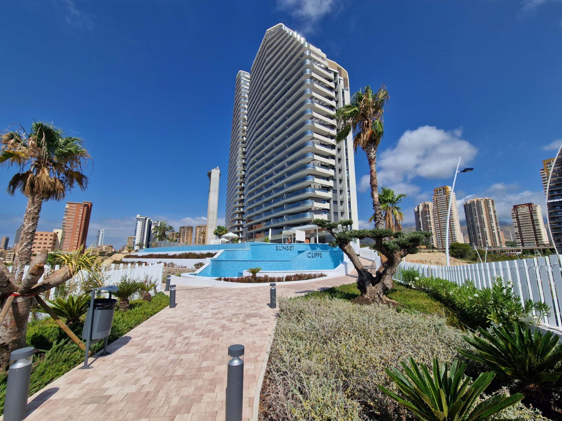 Magnificent large apartment for sale in one of the most emblematic residential complexes of Benidorm, Sunset Cliffs, based on the second line of the Poniente beach and a short distance to all amenities. ~~The property has 3 double bedrooms, 2 bathrooms, a fully equipped kitchen with an island, and a large living/dining area with access to an open terrace with fantastic sea views. The apartment is sold completely furnished and ready to move into. It comes also with two storage rooms and a private parking space in the underground parking.~~The residential complex Sunset Cliffs has over 12.000 sq m of communal areas distributed in different heights, ensuring views of the sea from all points. The communal areas include heated pool, adult pool, kids' pool with games area, panoramic gym, jacuzzis, chill-out area integrated into the pool, kids' Club room, video game room, and a range of sports grounds.~~Characteristics