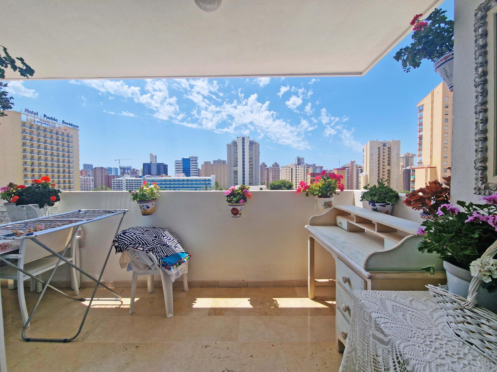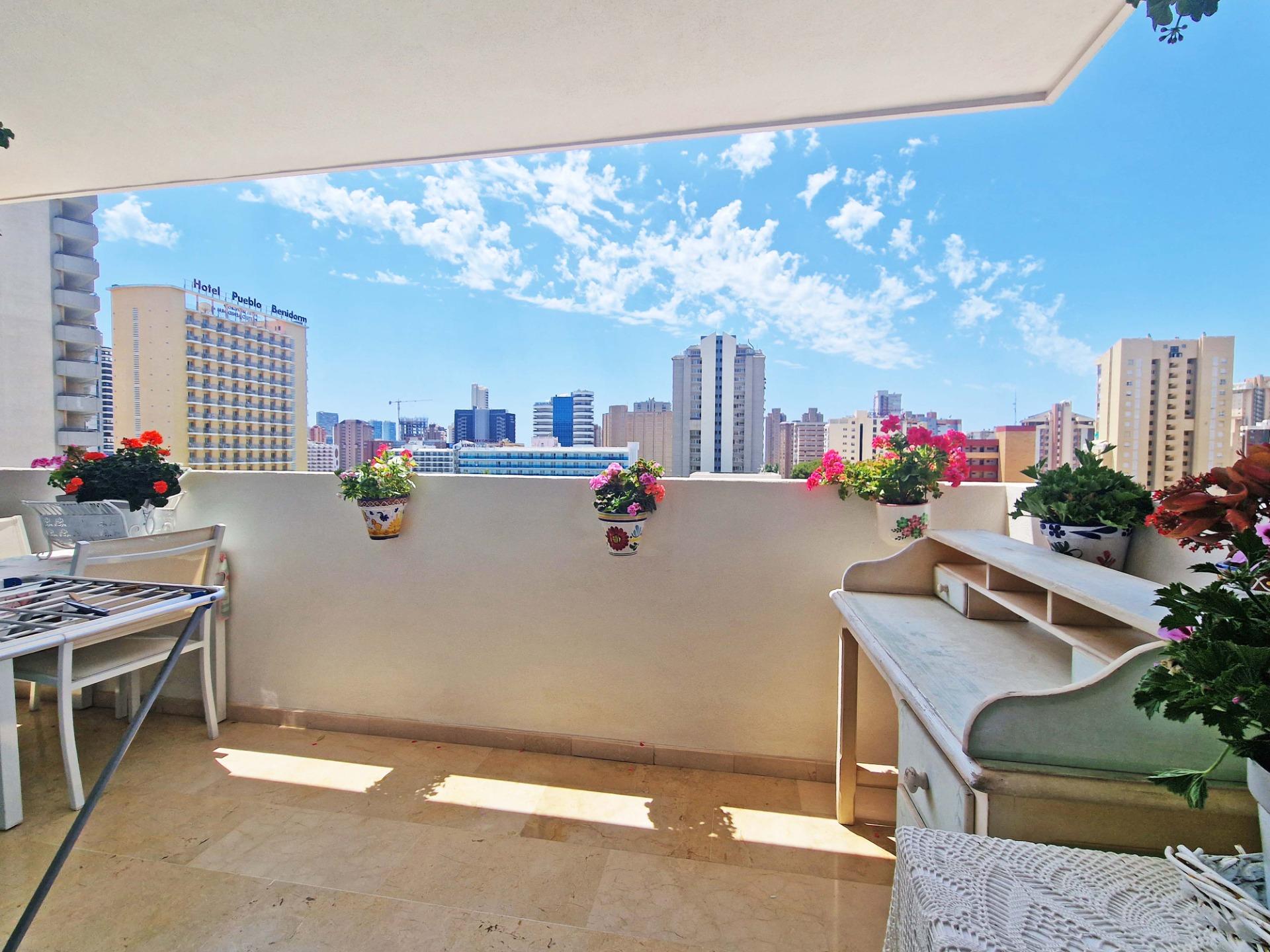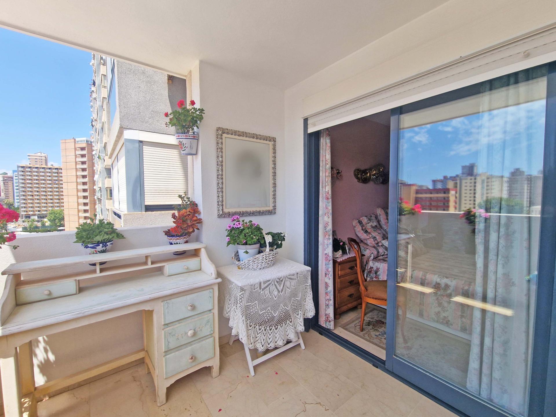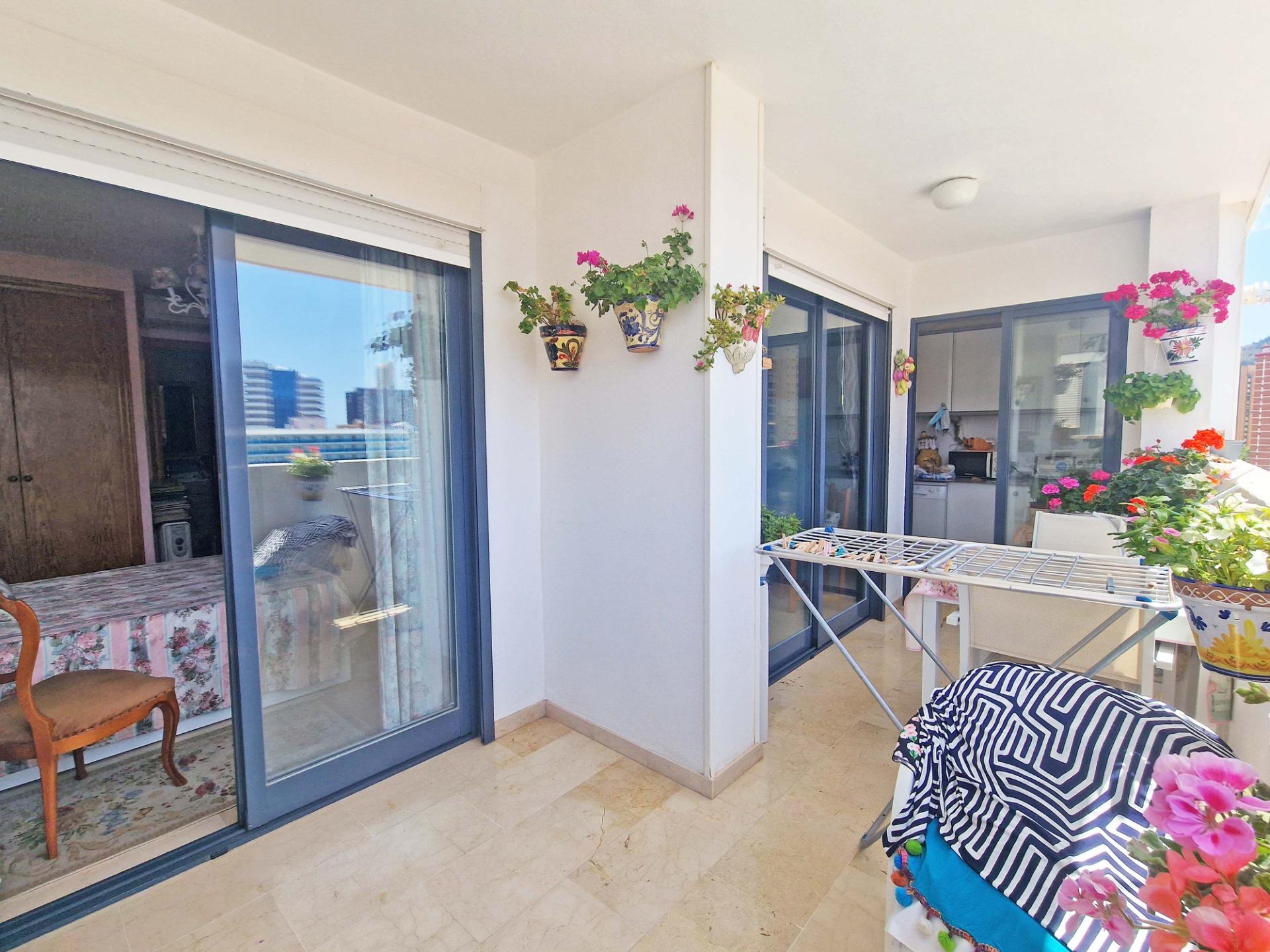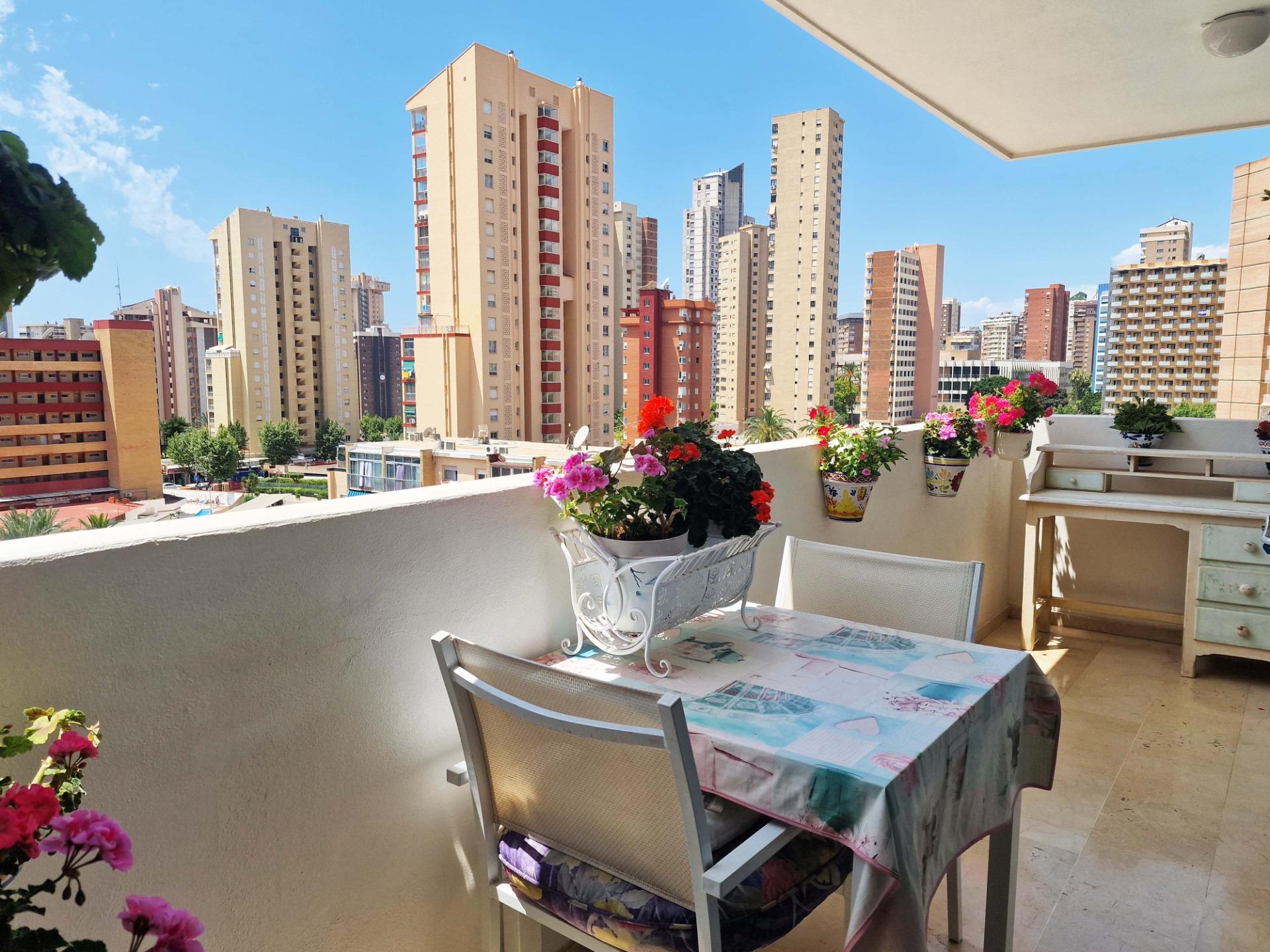 Продажа солнечной квартиры с 2 спальнями с открытой террасой в районе Леванте в Бенидорме, в 600 м от пляжа, в спокойной зоне рядом со всем необходимым. Знаменитый пляж Леванте находится всего в 7 минутах ходьбы по прямой дороге без перепадов высоты.~~В квартире 2 большие спальни, 2 ванные комнаты (одна из них – в главной спальне), светлая и просторная гостиная-столовая, полностью оборудованная отдельная кухня и открытая терраса с видом на Бенидорм. Оборудована системой кондиционирования воздуха тепло-холод.~~Закрытый жилой комплекс с общим бассейном и парковкой, недалеко от пляжа, ресторанов, баров, магазинов и всего необходимого.~Характеристики