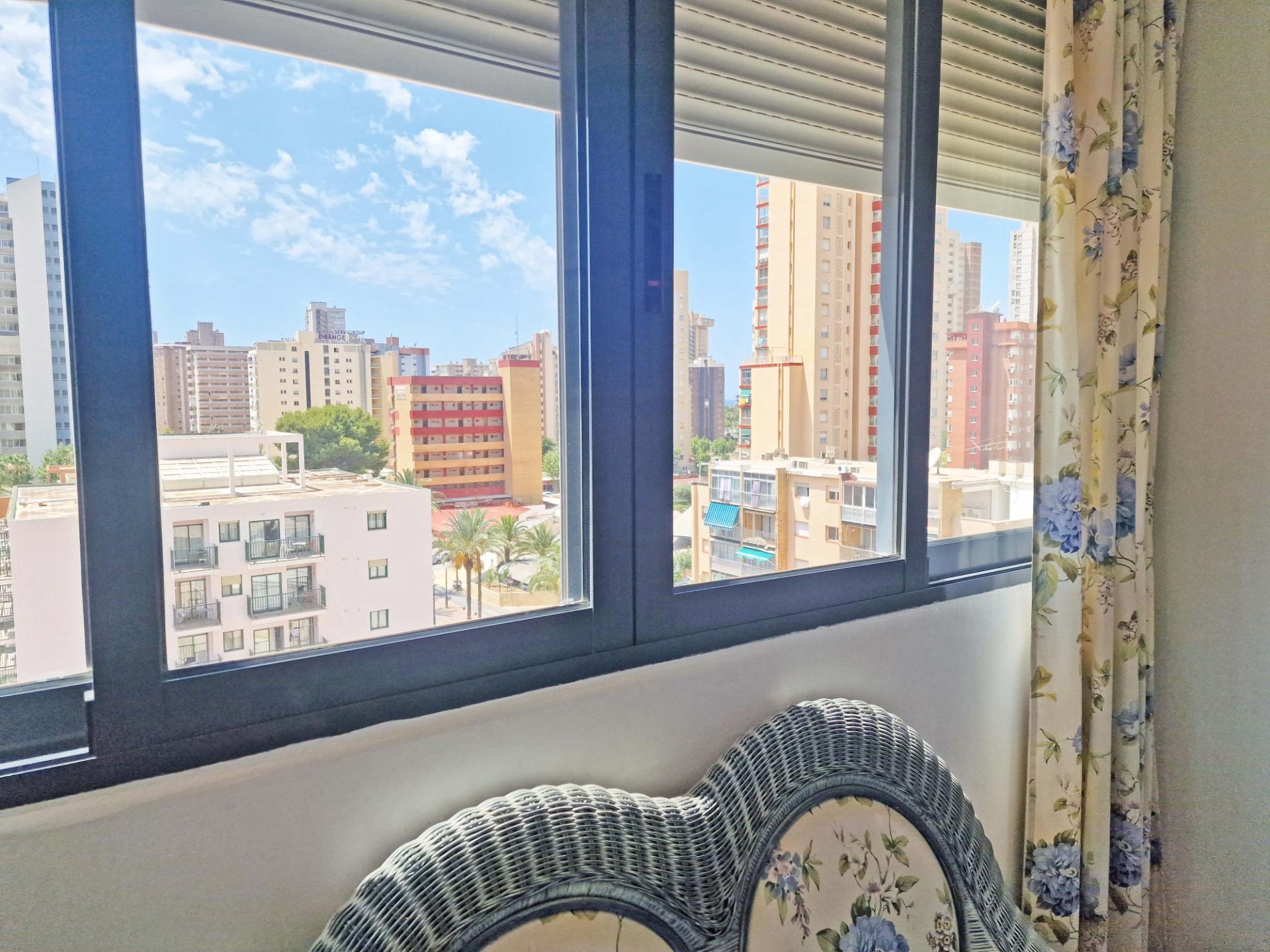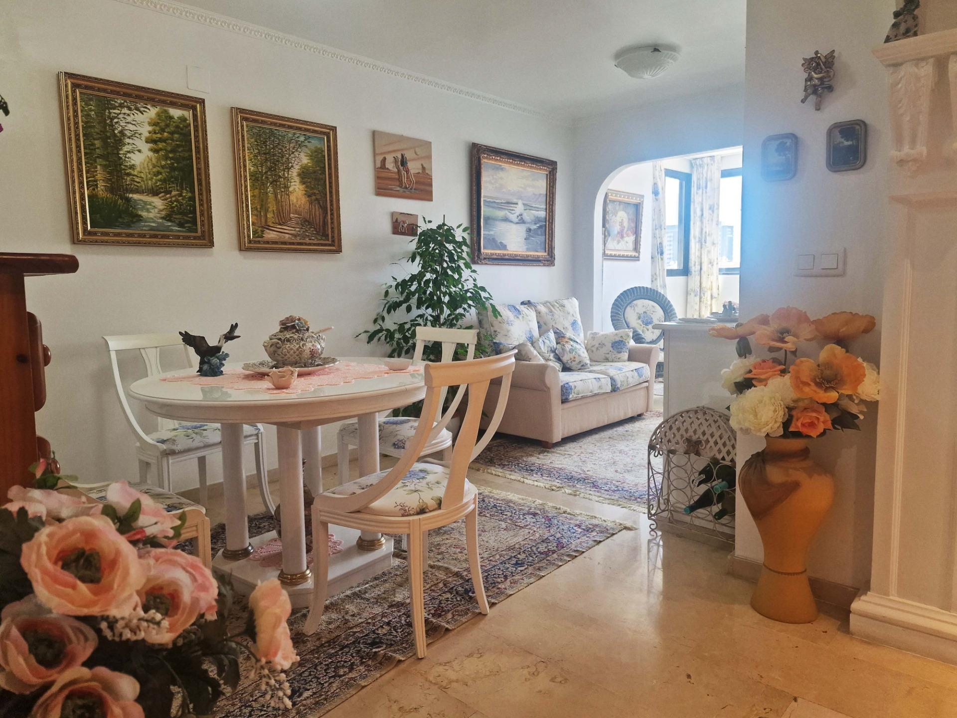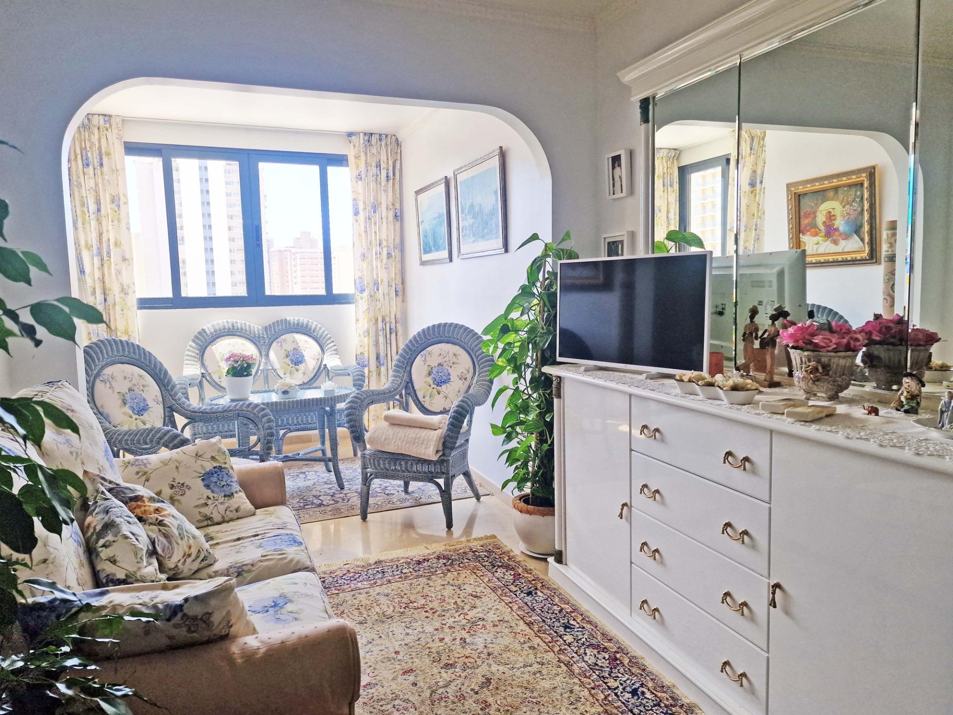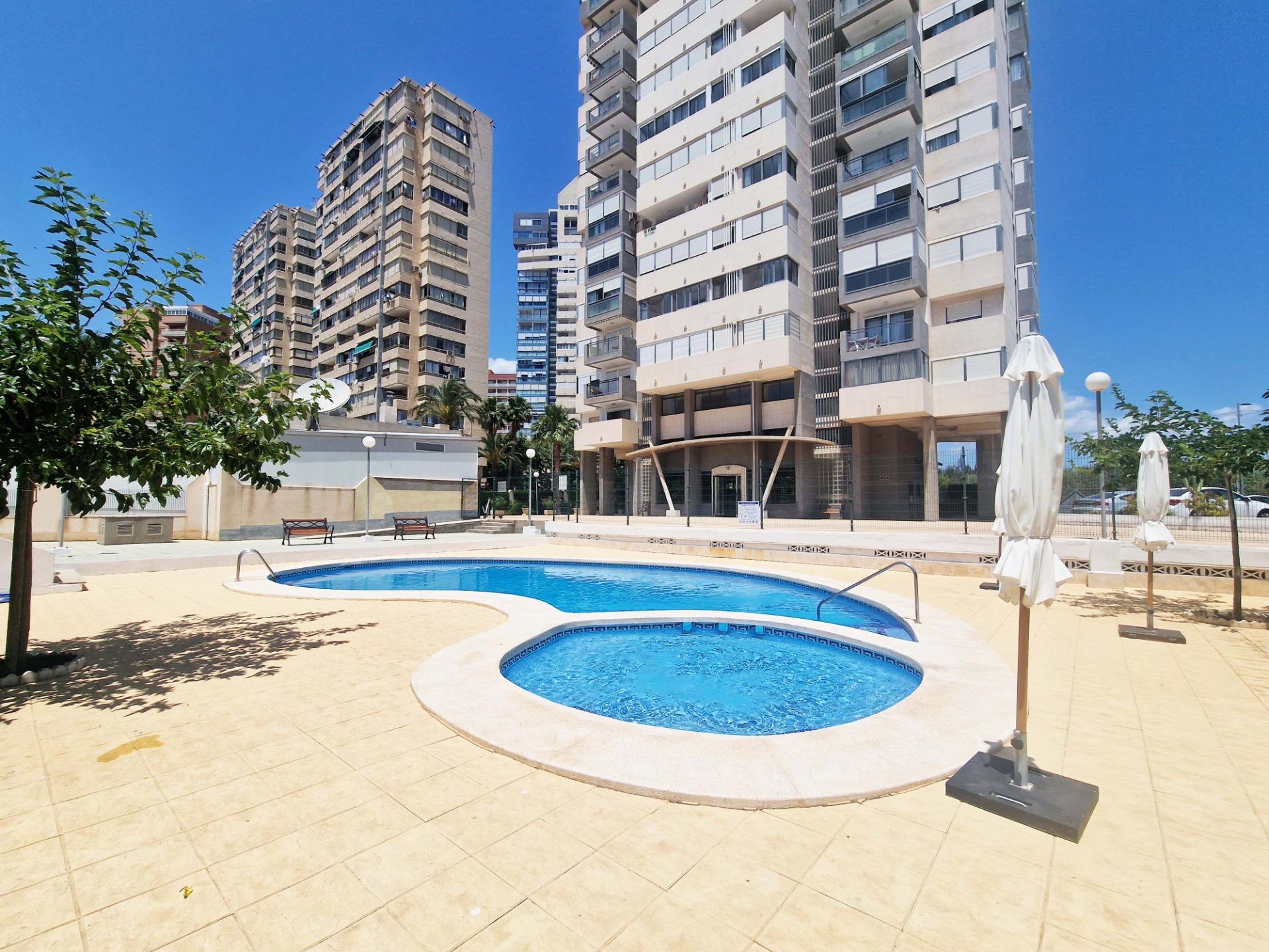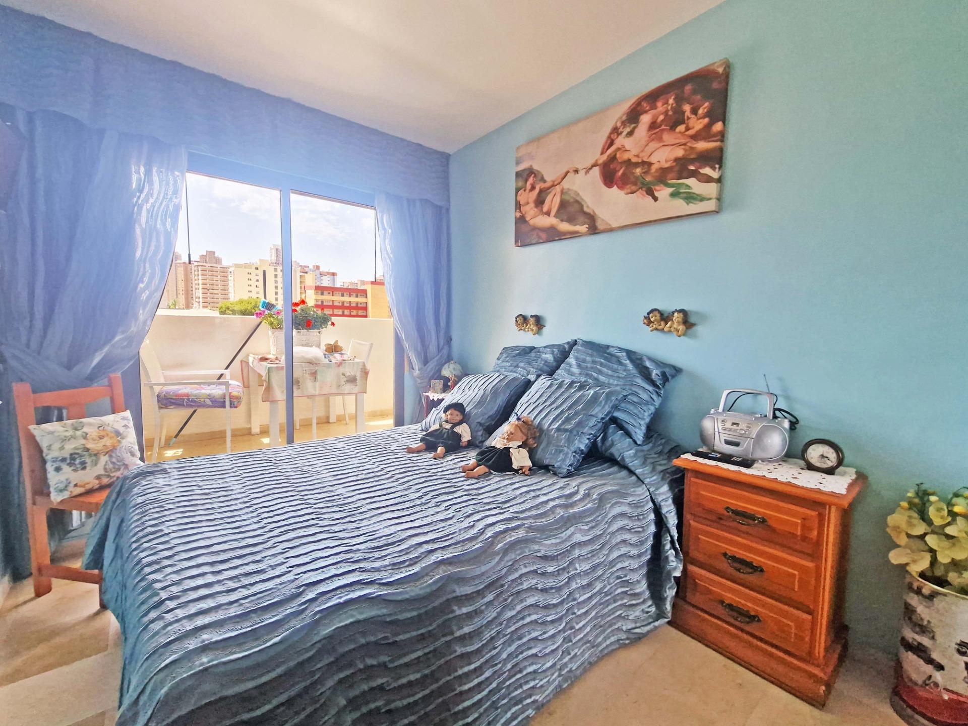 Продажа солнечной квартиры с 2 спальнями с открытой террасой в районе Леванте в Бенидорме, в 600 м от пляжа, в спокойной зоне рядом со всем необходимым. Знаменитый пляж Леванте находится всего в 7 минутах ходьбы по прямой дороге без перепадов высоты.~~В квартире 2 большие спальни, 2 ванные комнаты (одна из них – в главной спальне), светлая и просторная гостиная-столовая, полностью оборудованная отдельная кухня и открытая терраса с видом на Бенидорм. Оборудована системой кондиционирования воздуха тепло-холод.~~Закрытый жилой комплекс с общим бассейном и парковкой, недалеко от пляжа, ресторанов, баров, магазинов и всего необходимого.~Характеристики