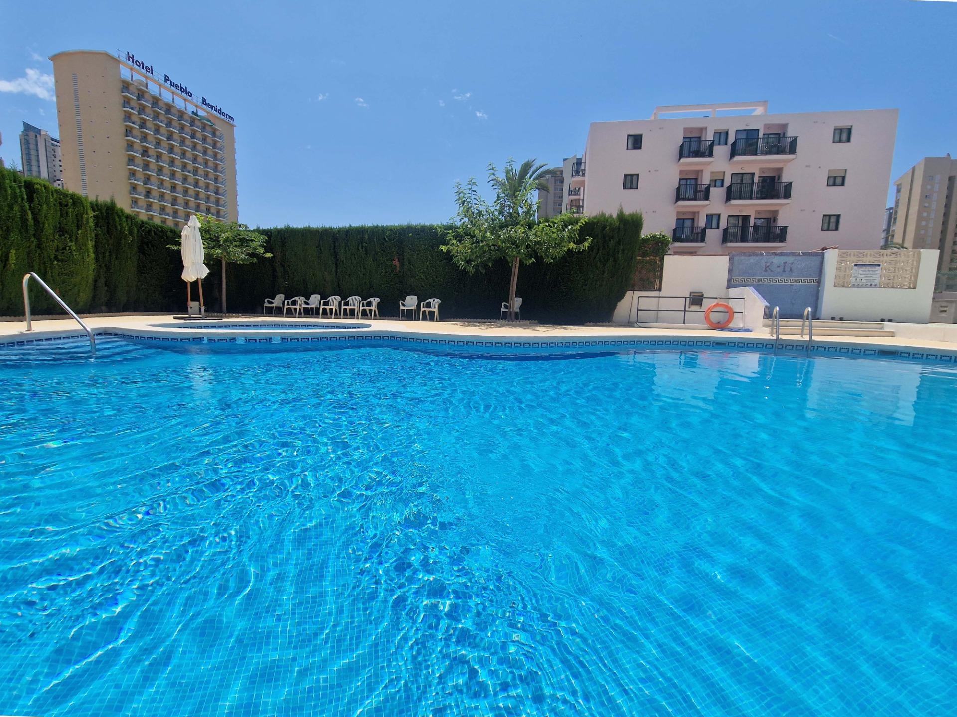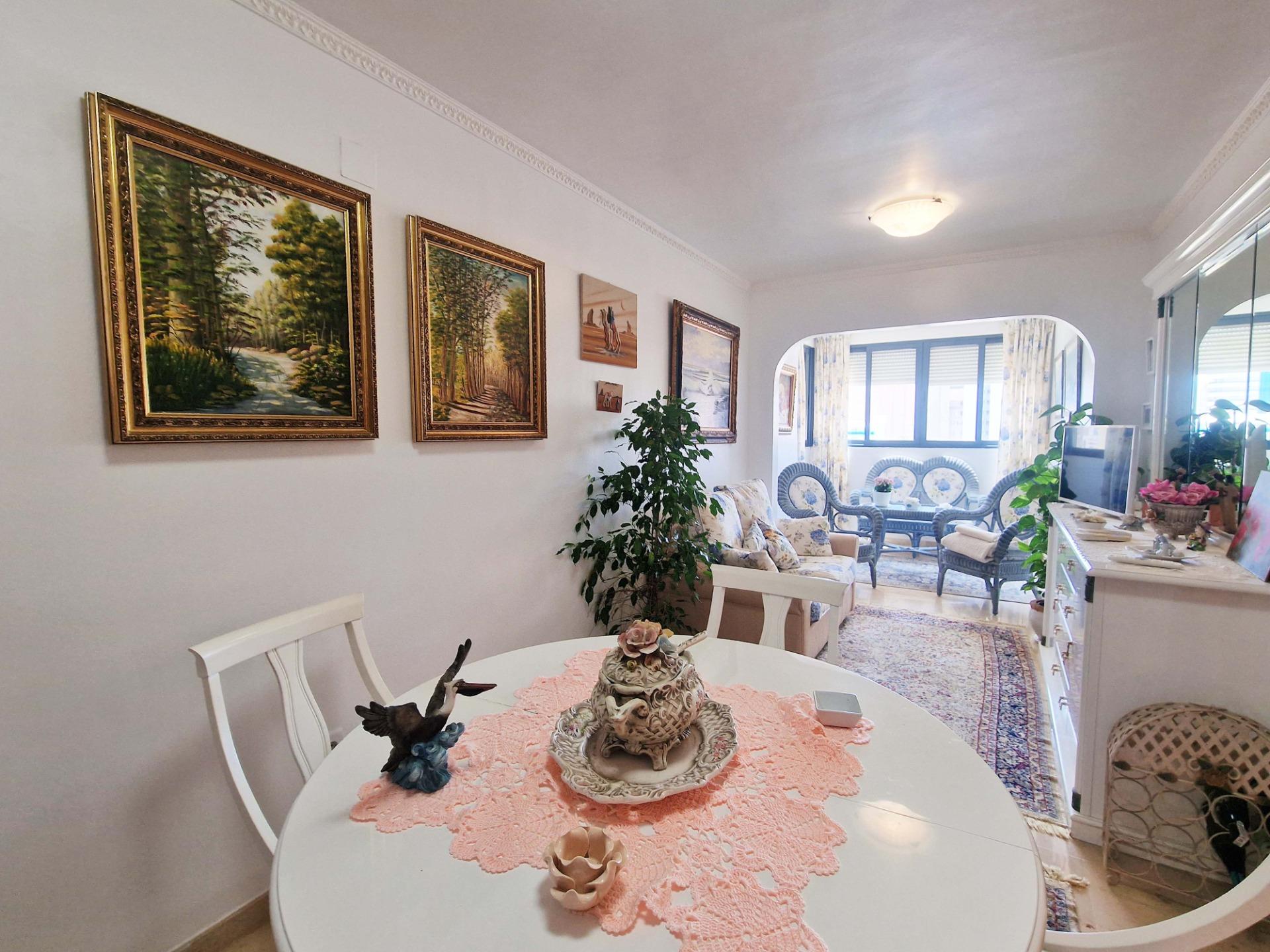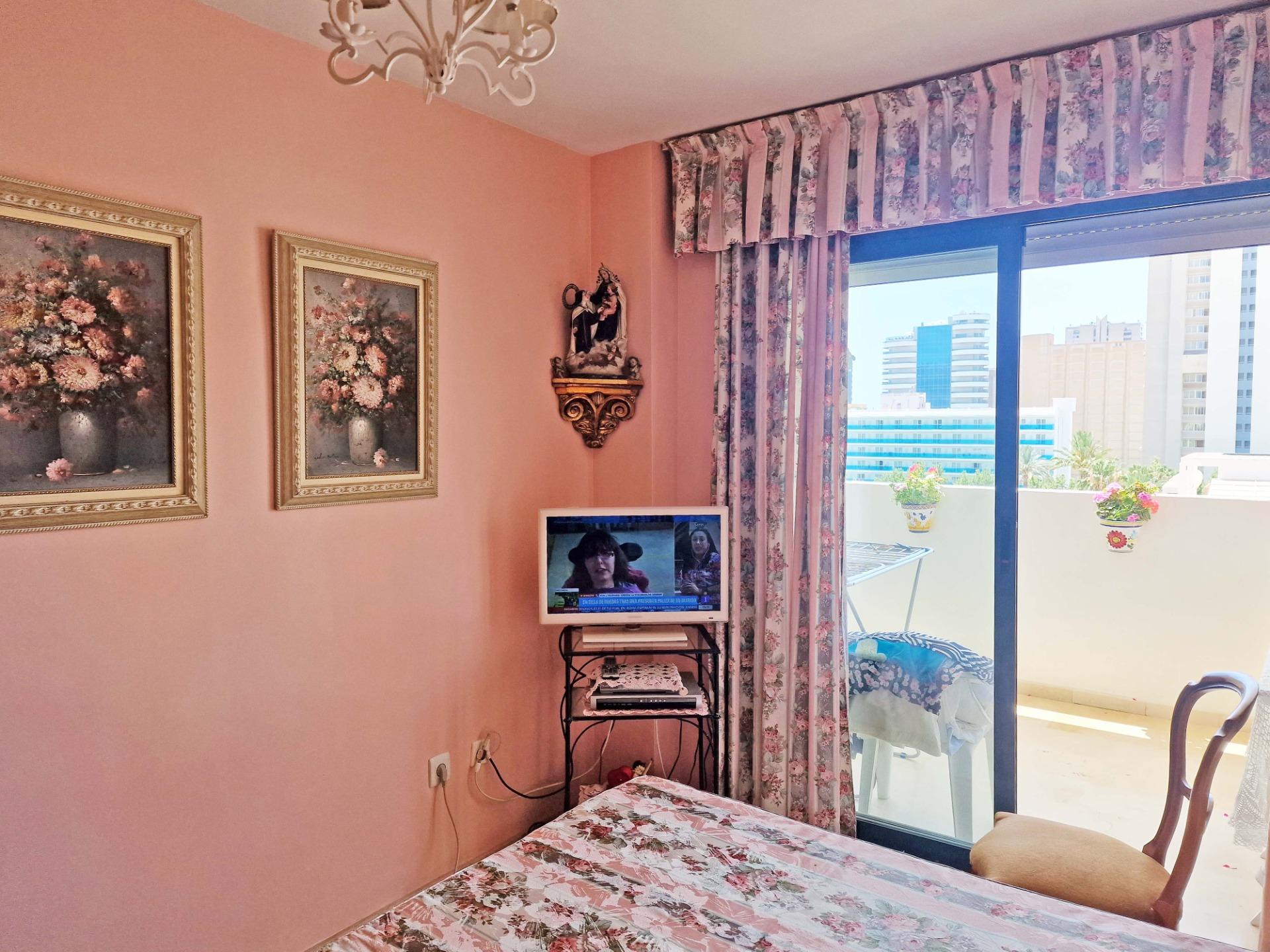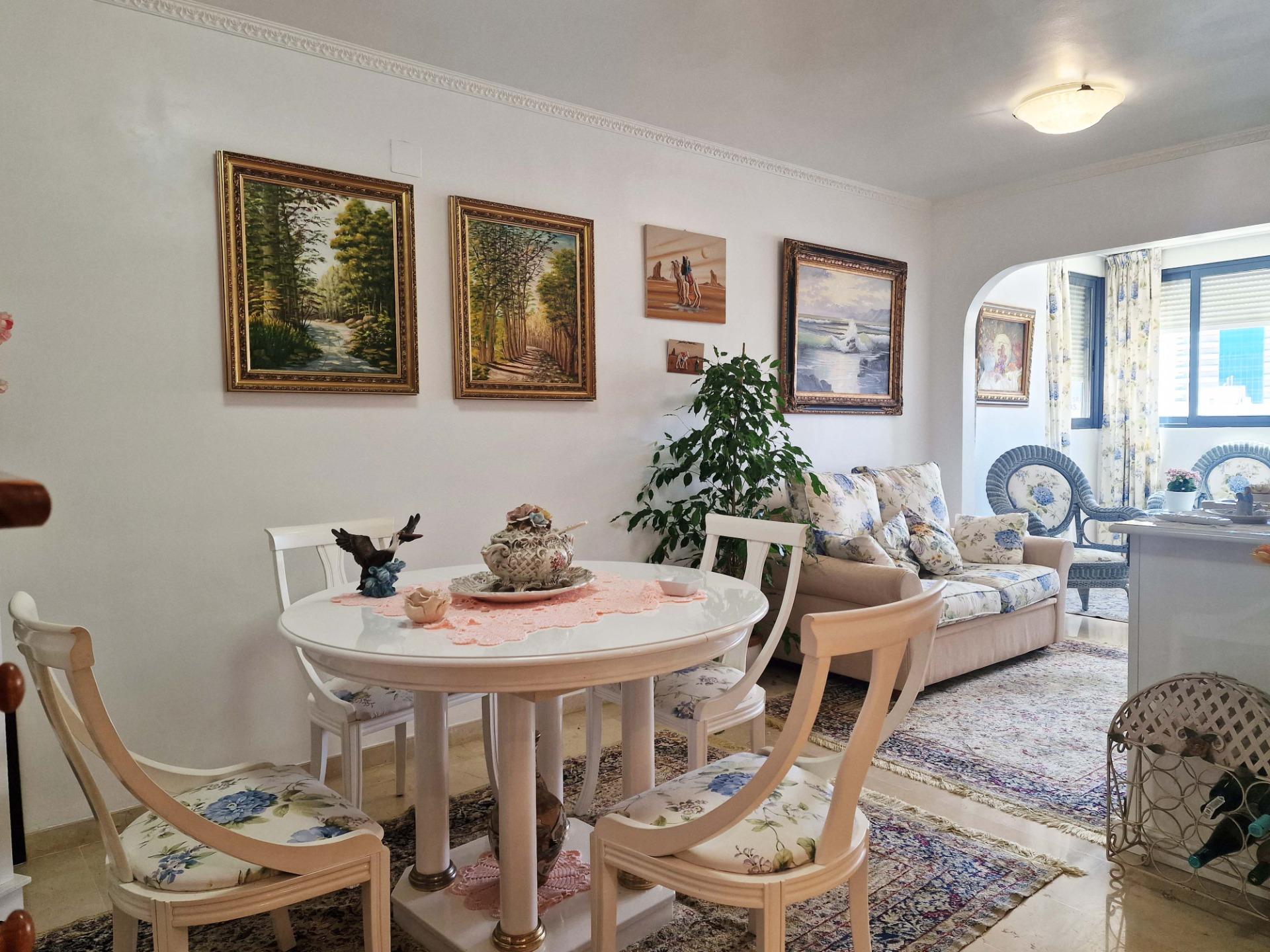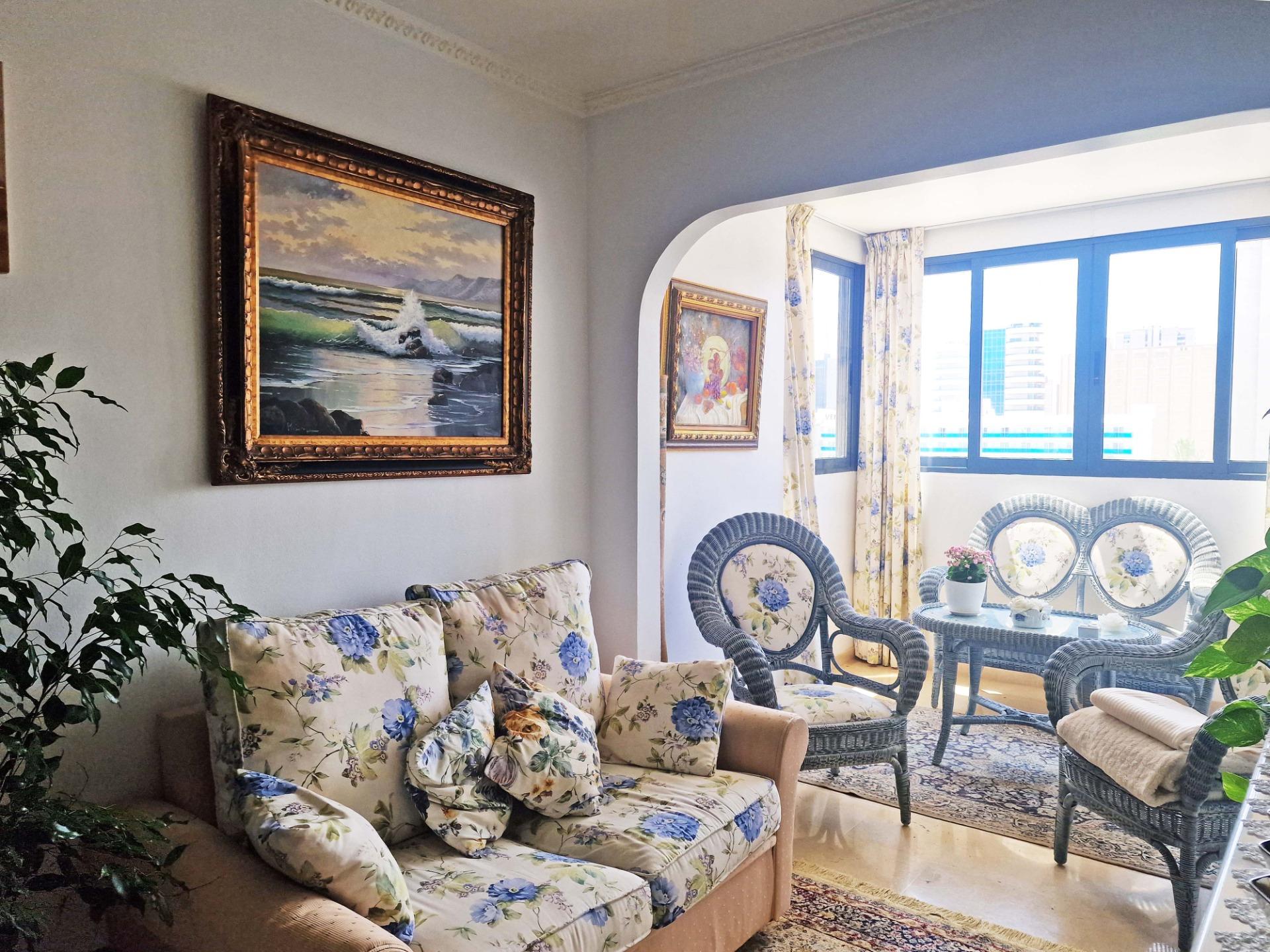 Продажа солнечной квартиры с 2 спальнями с открытой террасой в районе Леванте в Бенидорме, в 600 м от пляжа, в спокойной зоне рядом со всем необходимым. Знаменитый пляж Леванте находится всего в 7 минутах ходьбы по прямой дороге без перепадов высоты.~~В квартире 2 большие спальни, 2 ванные комнаты (одна из них – в главной спальне), светлая и просторная гостиная-столовая, полностью оборудованная отдельная кухня и открытая терраса с видом на Бенидорм. Оборудована системой кондиционирования воздуха тепло-холод.~~Закрытый жилой комплекс с общим бассейном и парковкой, недалеко от пляжа, ресторанов, баров, магазинов и всего необходимого.~Характеристики