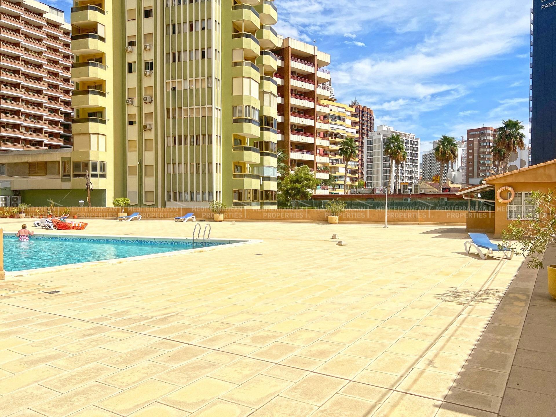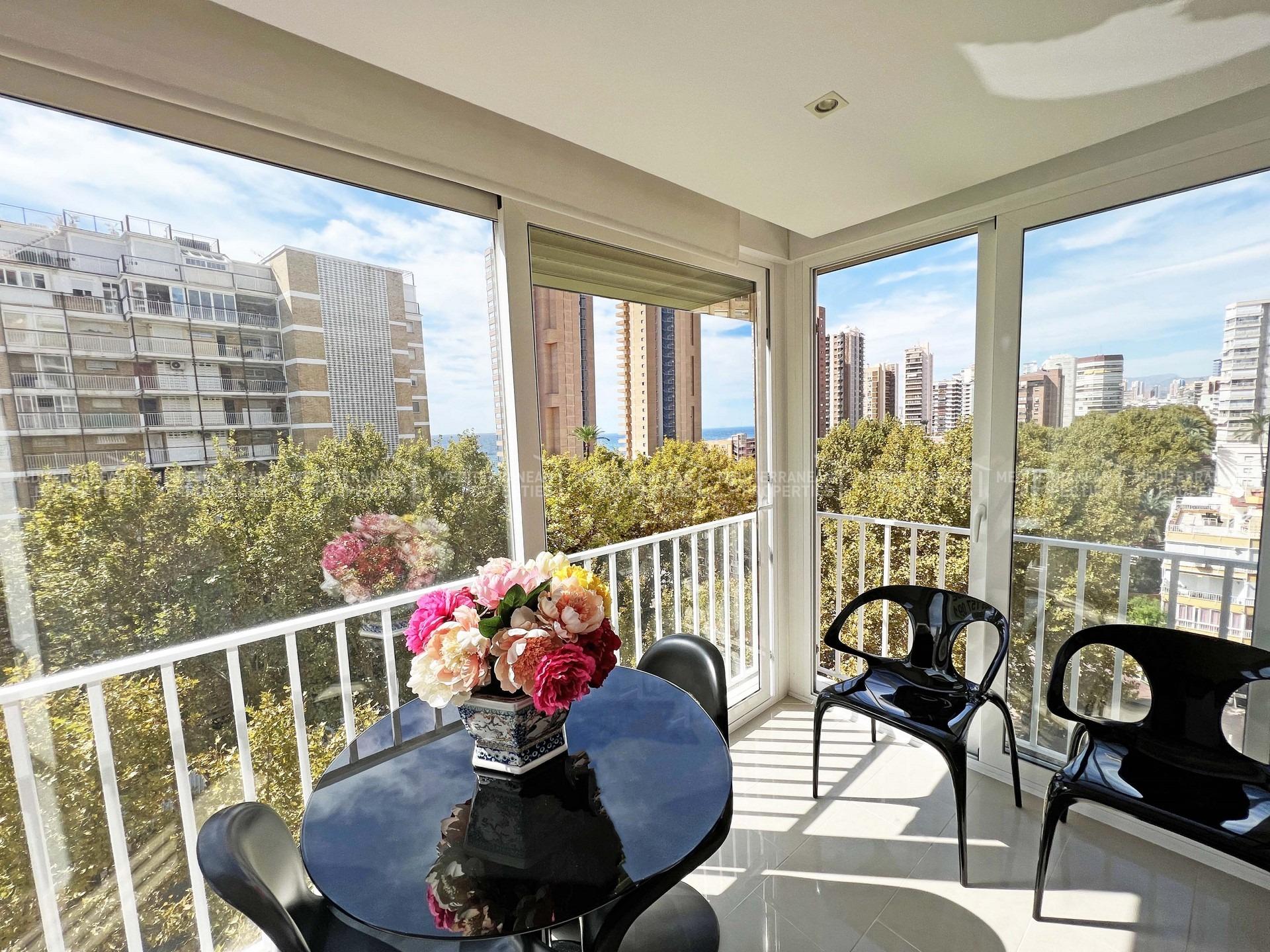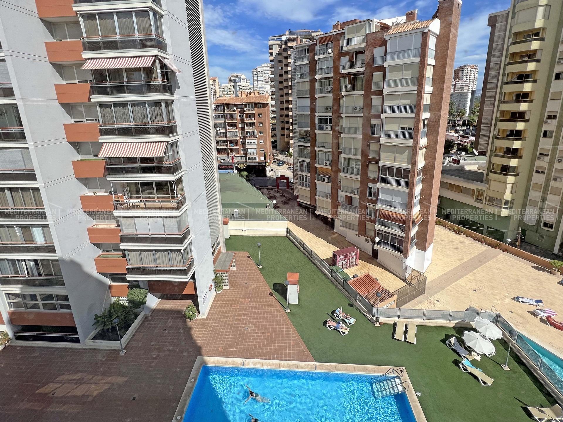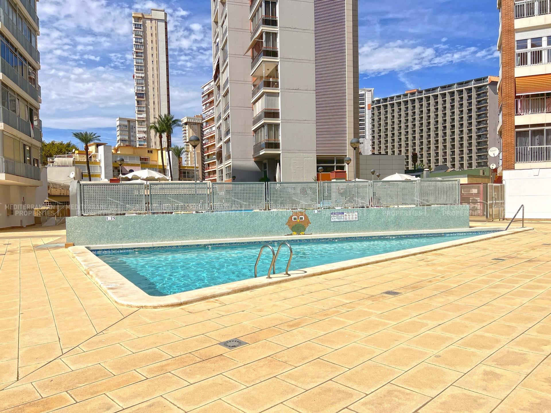 Apartment for sale a few meters from Benidorm beach and all its restaurants and bars.~The house consists of 79m2 distributed in a magnificent living room with windows all around and with clear views, a bedroom with a toilet, another bedroom with a glazed terrace, a bathroom with a shower, a kitchen and a small storage room.~The building has a private garage and community pool with large space to do various activities.~Characteristics