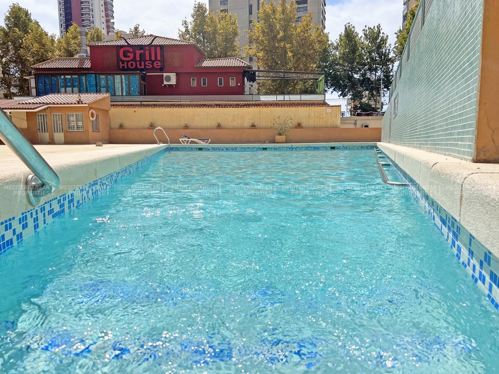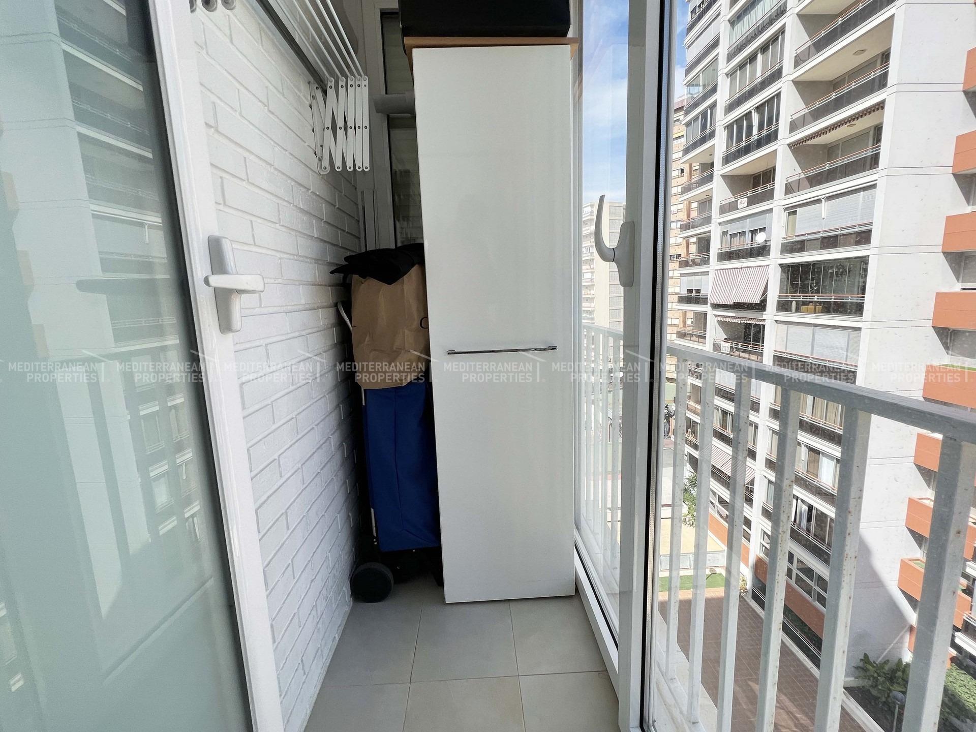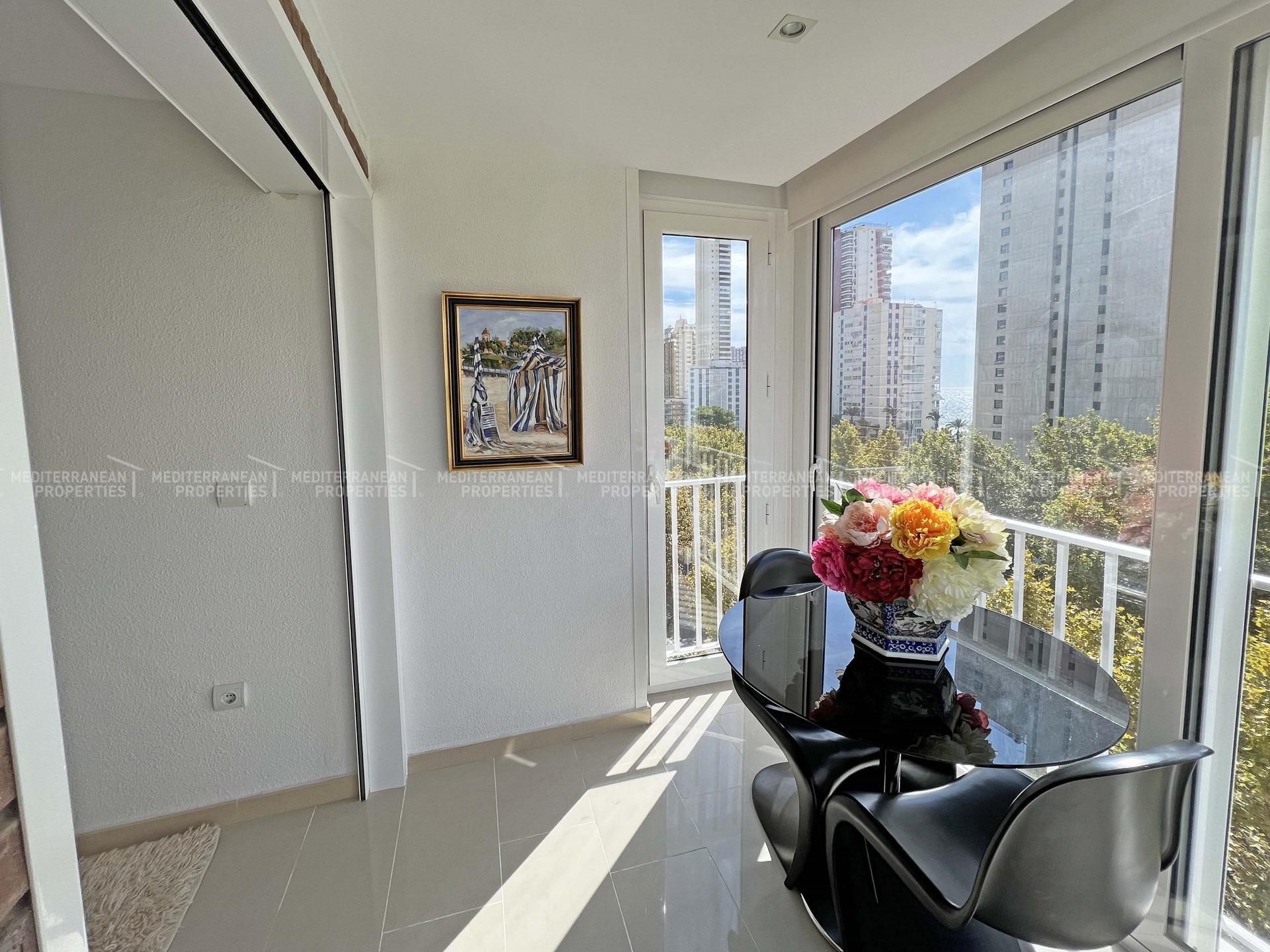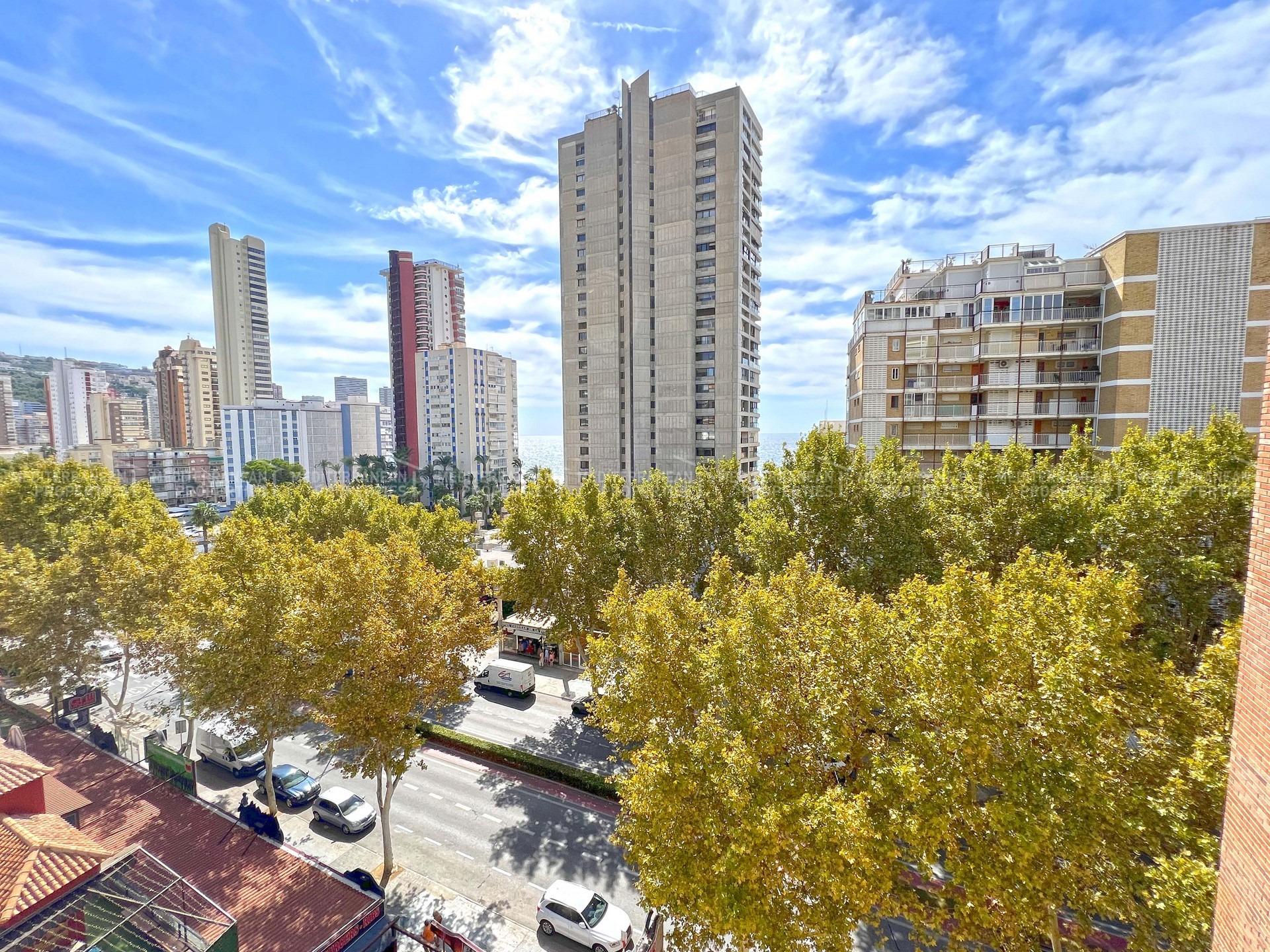 Apartment for sale a few meters from Benidorm beach and all its restaurants and bars.~The house consists of 79m2 distributed in a magnificent living room with windows all around and with clear views, a bedroom with a toilet, another bedroom with a glazed terrace, a bathroom with a shower, a kitchen and a small storage room.~The building has a private garage and community pool with large space to do various activities.~Characteristics