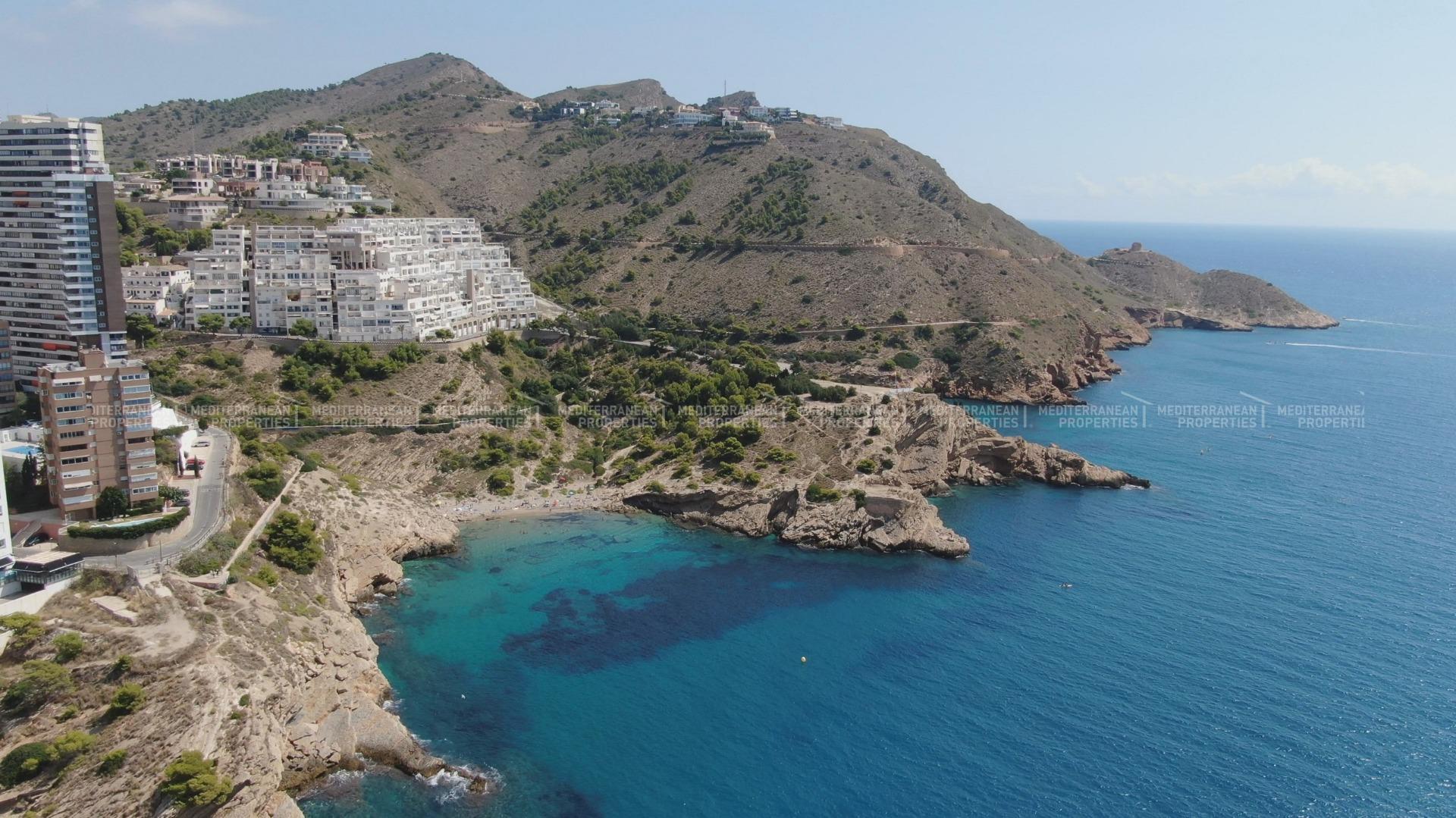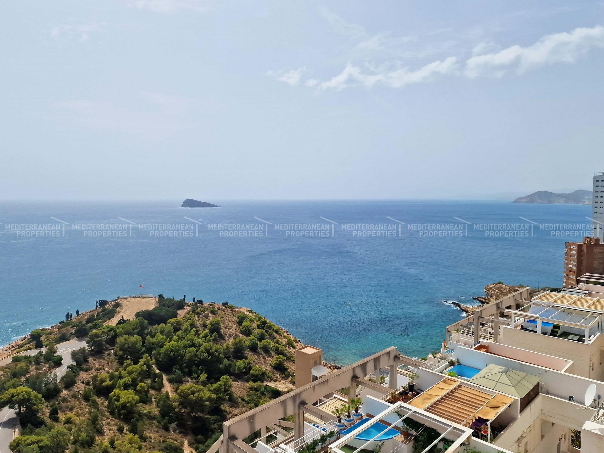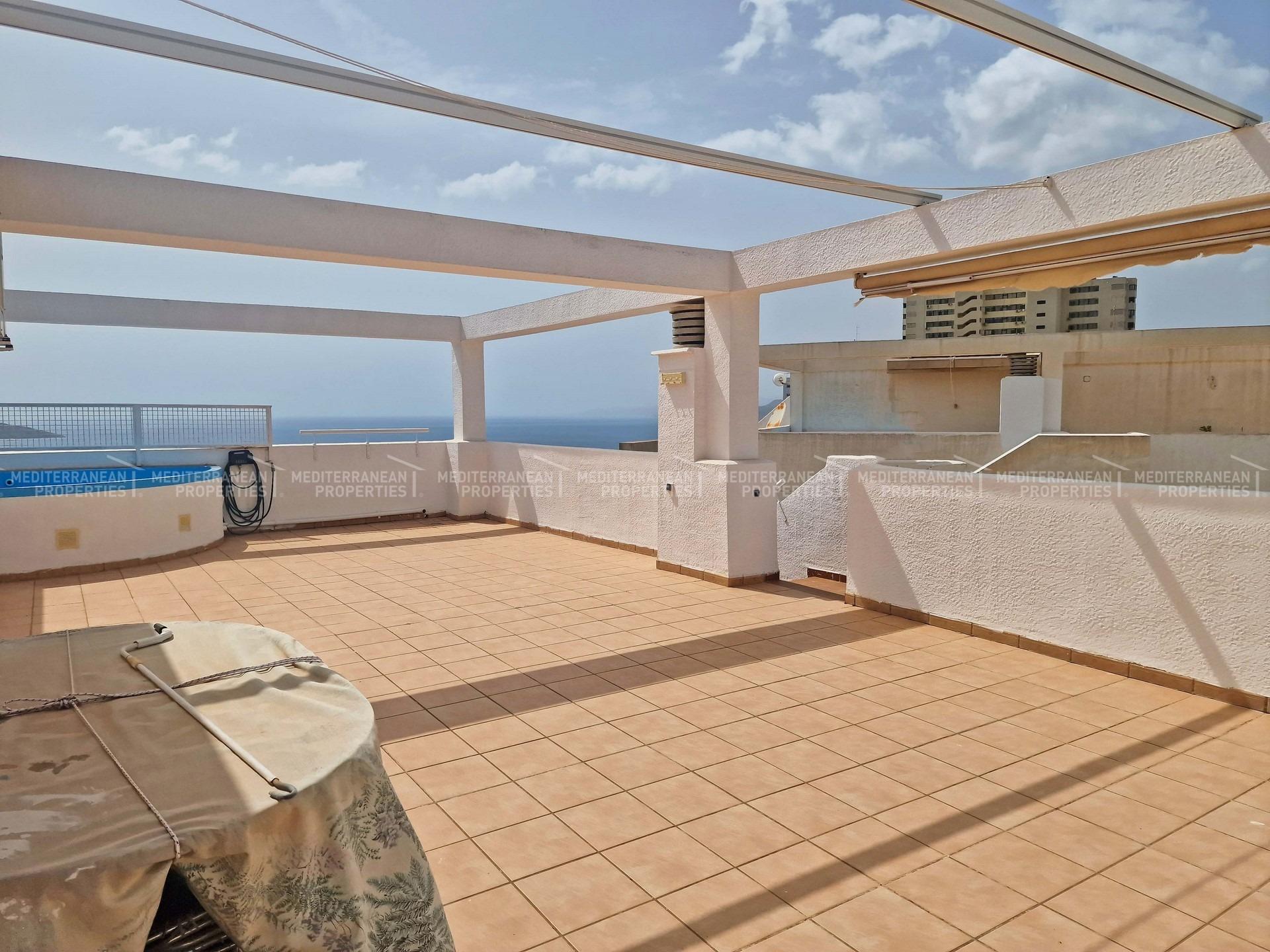 Bright penthouse with a rooftop terrace for sale in the Rincon de Loix area of Benidorm. The building based in front of the Cala Almadraba beach, next to the Cala Tio Chimo beach and at the beginning of the hiking route to the ruined tower Punta de Cavall, offers one of the best sea views in Benidorm.~~The penthouse distributes in 2 bedrooms with fitted wardrobes, 1 bathroom, a living/dining room, and an open-plan kitchen. The property boasts a very large open and sunny 2-floor terrace with beautiful views over the sea and Benidorm. On the upper floor there is a built hot tub with great views.~~The price includes a private underground parking space. It is a gated complex with concierge and a communal swimming pool with excellent sea views. The Levante beach is 10 min walk away.~Characteristics